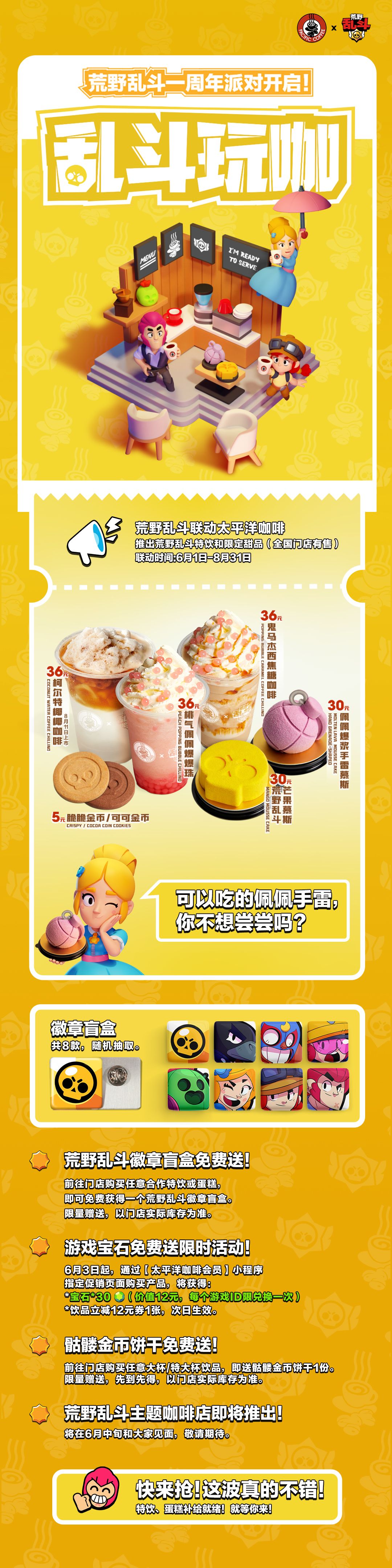 荒野乱斗x 太平洋咖啡 联动,乱斗玩咖已上线!6月3日至8月31日,太平洋咖啡推出荒野乱斗定制特饮&甜品,全国300多家门店均有售!