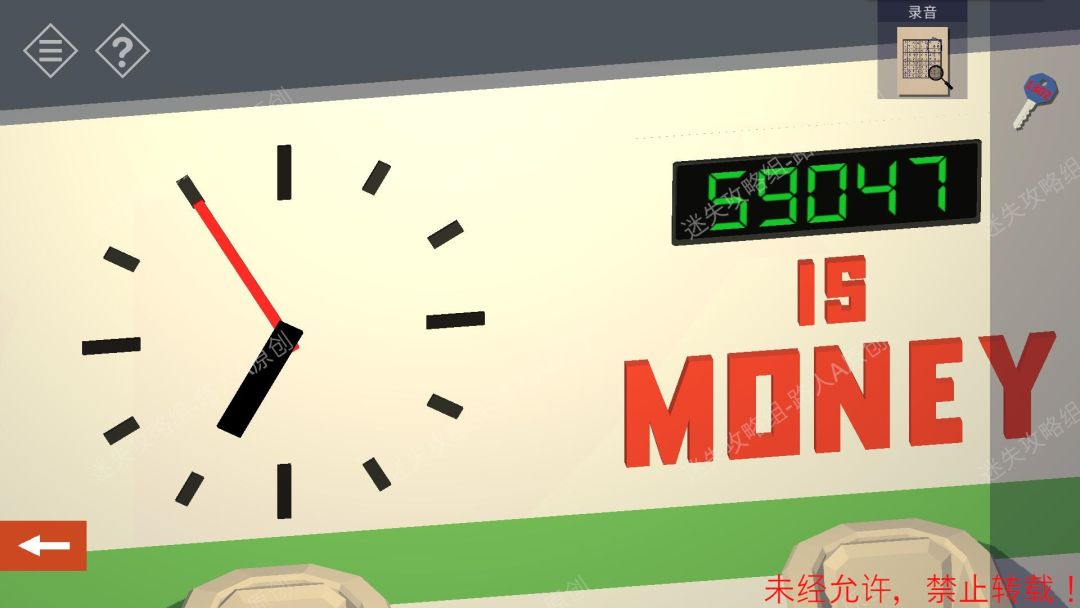 14.返回二楼大厅,把墙上的钟表调整为【7:55】,出现密码【59047】。14.1