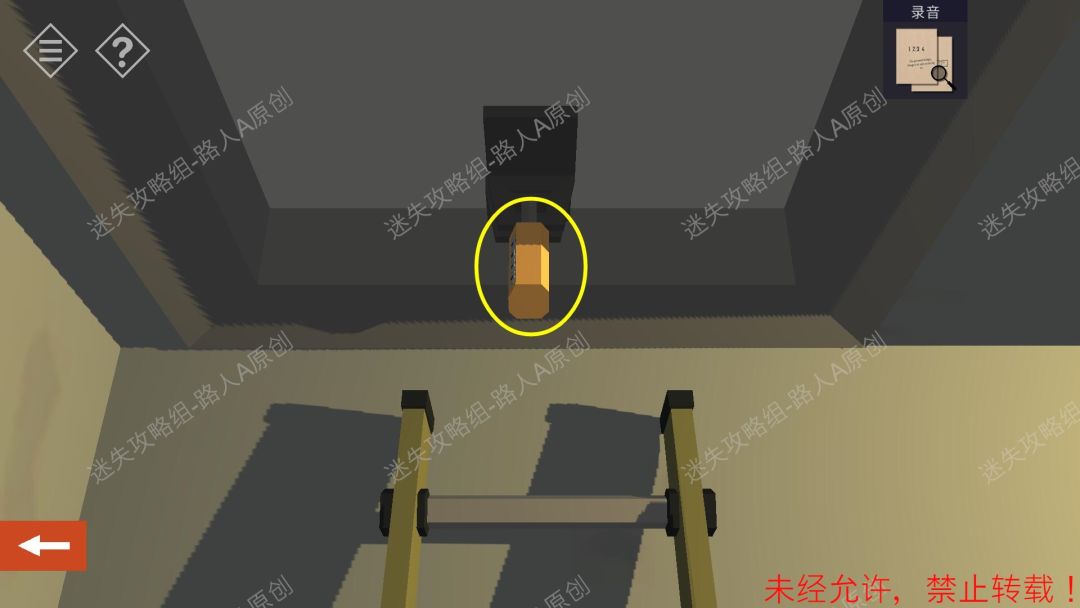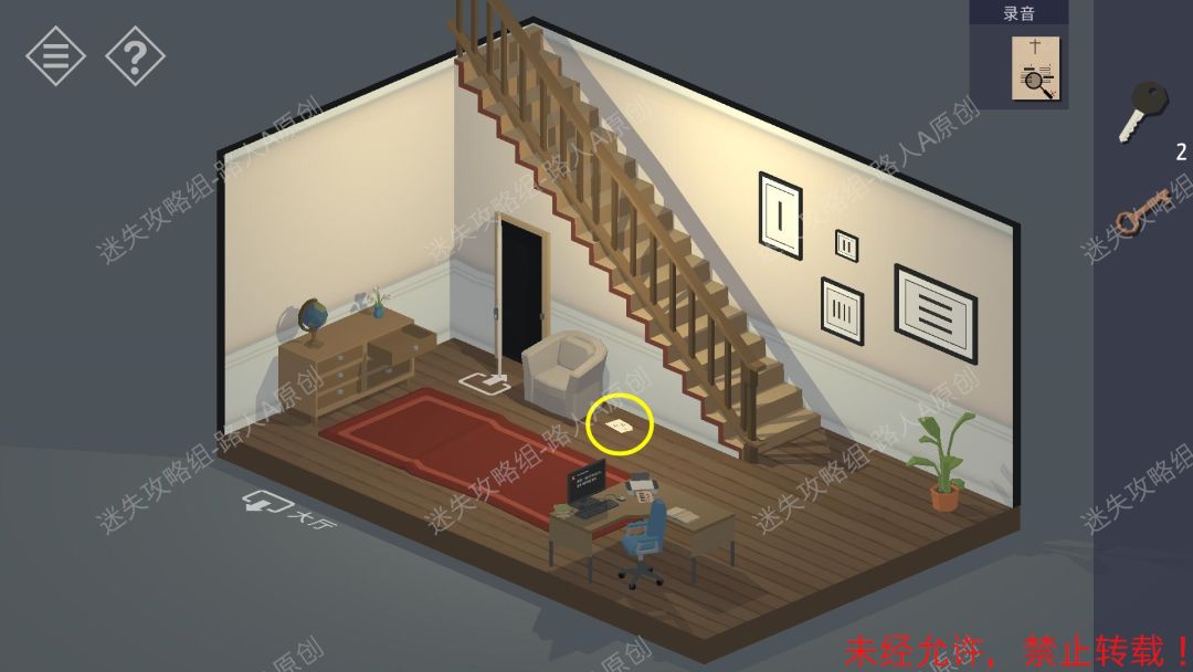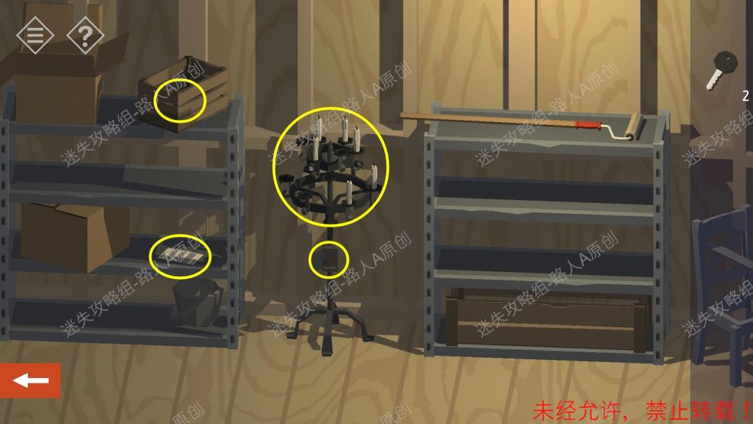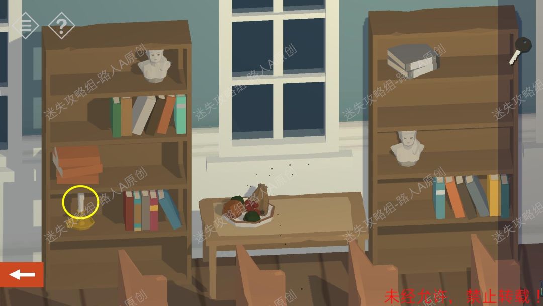 12.返回办公室,上楼梯。拾取架子上的【蜡烛】和【纸条】,然后把7根【蜡烛】放到蜡烛架上(放下蜡烛,如果台座下降,即为正确位置),获得【钥匙】。12.1