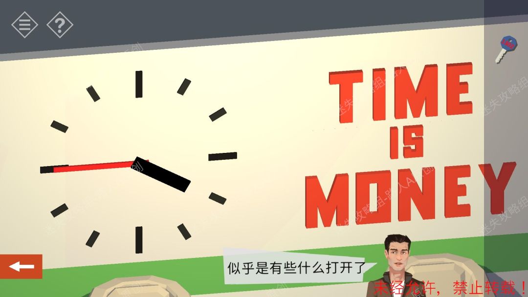 4.从楼顶的门进入,走到一楼大厅,注意墙上的钟表时间。然后打开前台的抽屉,拾取【文件夹】和【项链】。5.返回二楼大厅,把墙上的钟表调整为【4:45】,解锁门。5.1