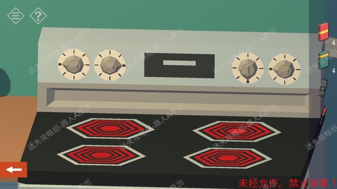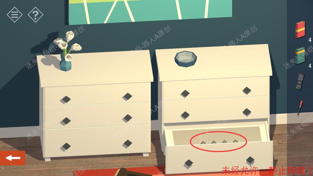 11.返回客厅,移开沙发,用【刀】割开沙发背面的补丁,拾取【红色书本】。12.打开白色柜子最底下的抽屉,按照厨房的火炉按钮提示,调整抽屉里的4个按钮方向,拾取【纸条】。12.1