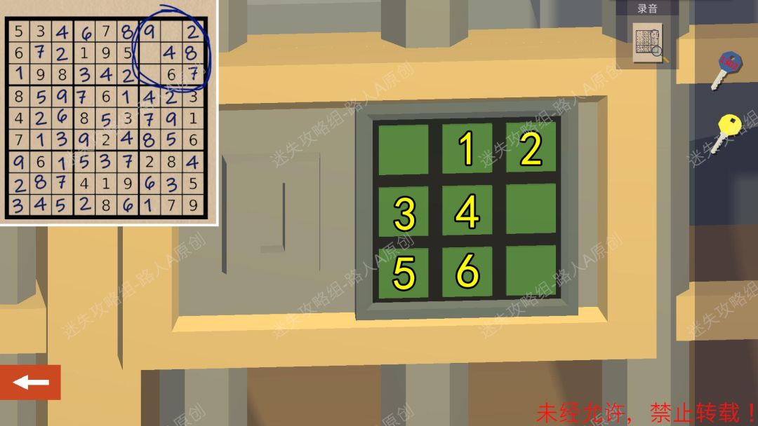 17.进入金库,拾取桌子上的【黄色钥匙】。然后根据【纸条】的提示,解决栅栏的密码锁。(纸条提示:每一行(列)都是数字1到9,根据这个规律可以找出缺失的3个数字,然后根据顺序点击按键。)17.1