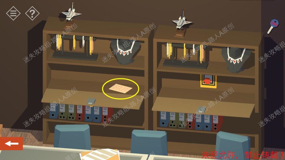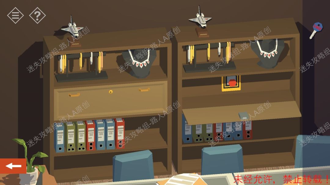 18.返回二楼会议室,点击暗门的【红色按钮】,切换回柜子,然后用【黄色钥匙】打开左边的柜子,拾取【纸条】。18.1