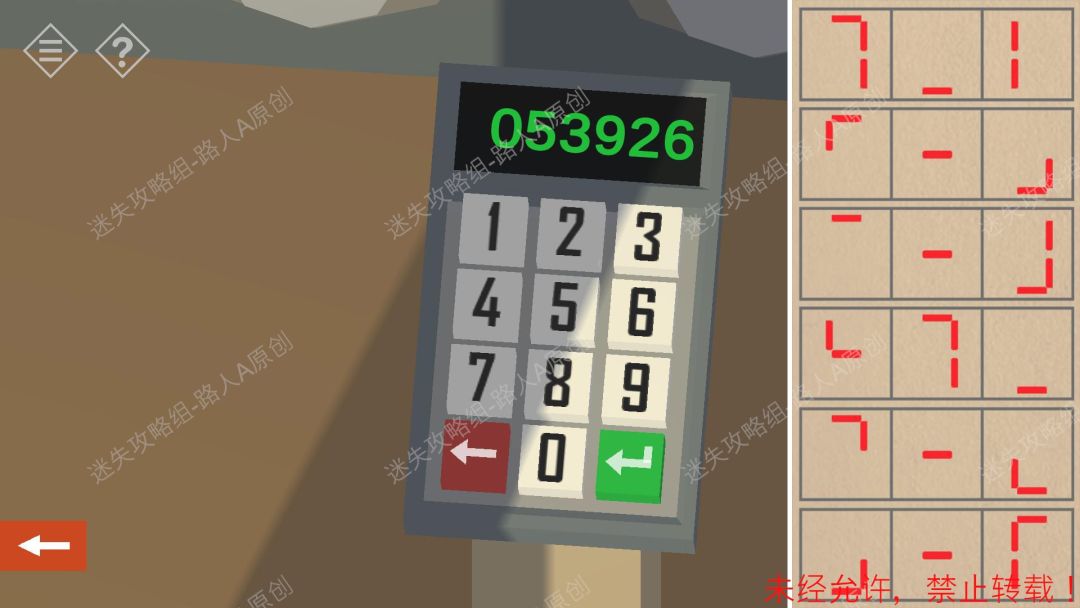 19.返回一楼金库,根据【纸条】的提示,输入密码【053926】,解锁门。(纸条提示:每一行的图形合并得到一个数字。)19.1