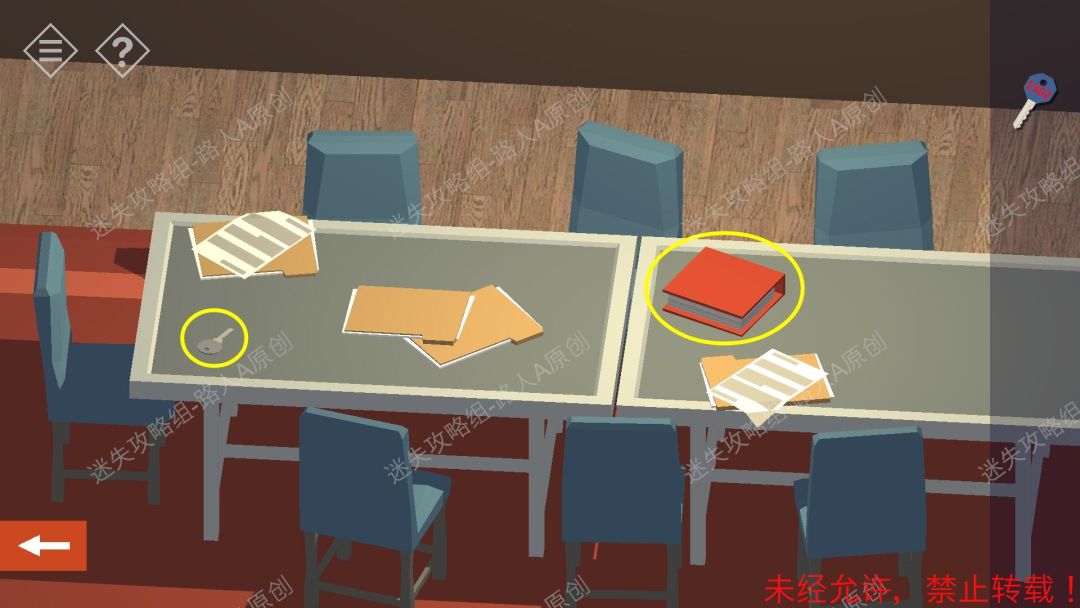 6.进入二楼的会议室,拾取桌子上的【灰色钥匙】和【文件夹】,以及办公桌下的【飞机模型】。6.1、6.2