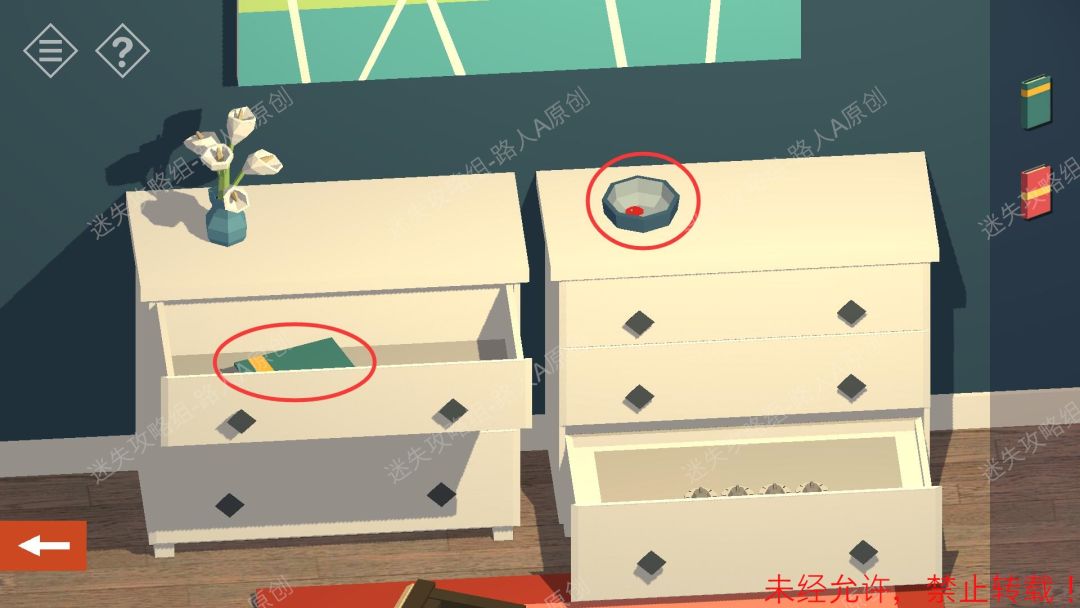 5.拾取白色柜子上的【红色钥匙】,然后打开抽屉,拾取【绿色书本】。5.1