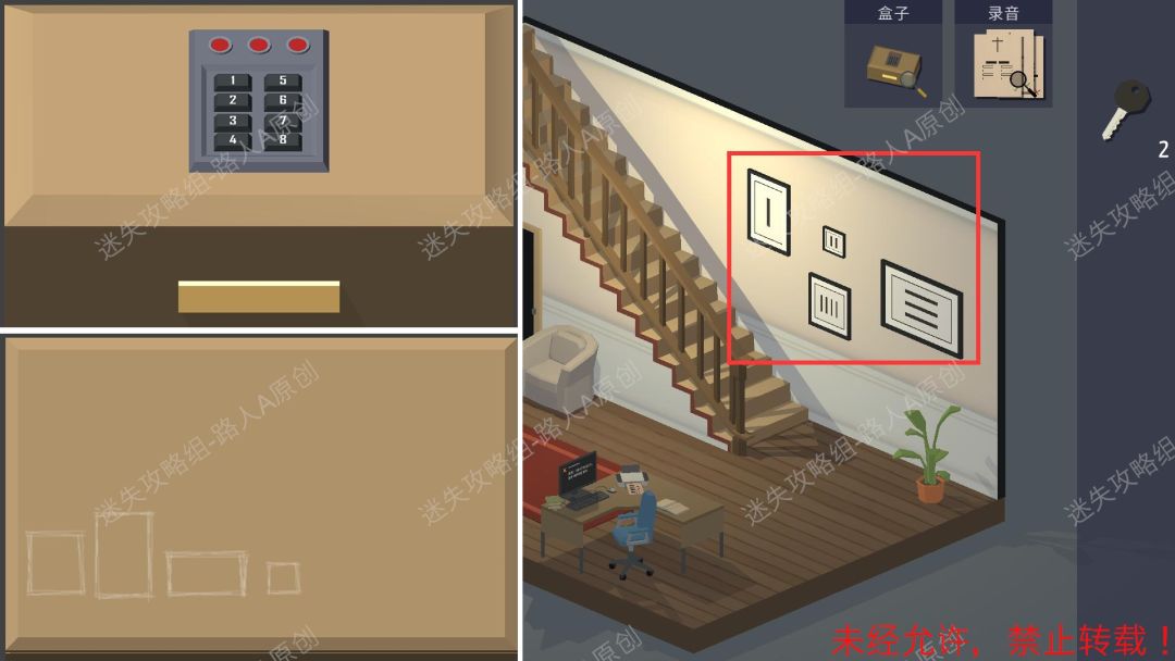 16.根据【盒子】底部的图形提示,对应楼梯旁边的4副挂画,获得密码【4132】。打开盒子,获得【钥匙】。16.1