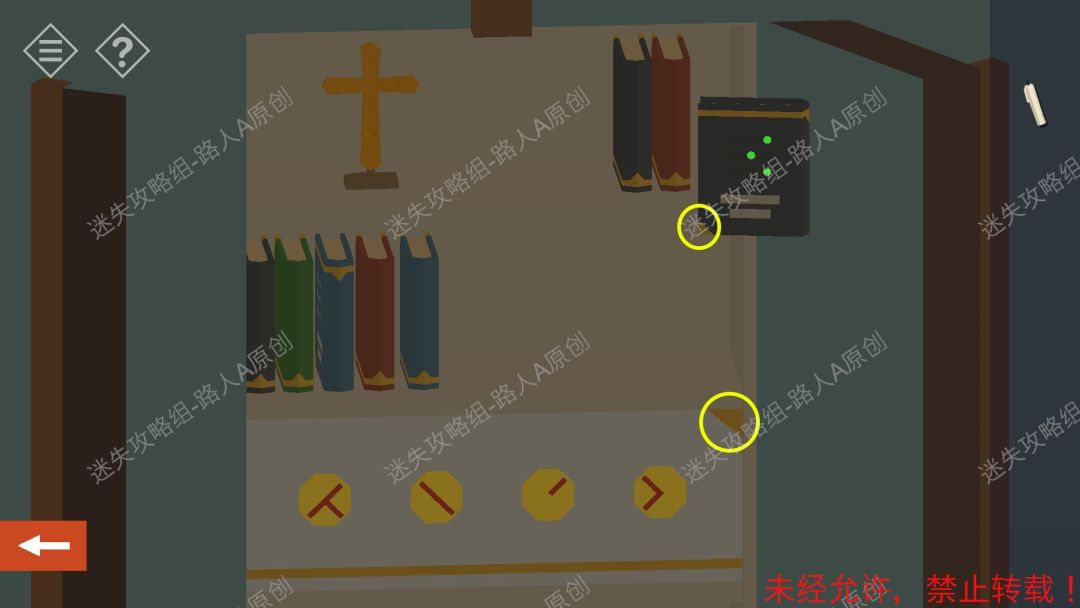11.点击隐藏的书架,拾取【蜡烛】。关灯后再查看书架的书本,书的封面会出现绿色的荧光图案,找出与下面转盘相对应的,然后再根据荧光图案调整转盘,获得【钥匙】。(注意书本封面的黄色三角形位置,对应下面转盘右上角的三角形。)11.1