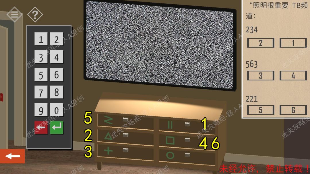 13.返回卧室,点击墙上的壁灯,用【螺丝刀】拧开灯罩的螺丝,然后再拧开灯泡。14.对电视使用【遥控器】,根据纸条的提示,分别查看频道【234】、【563】和【221】,注意这些频道对应的抽屉图案以及顺序,得到密码。14.1