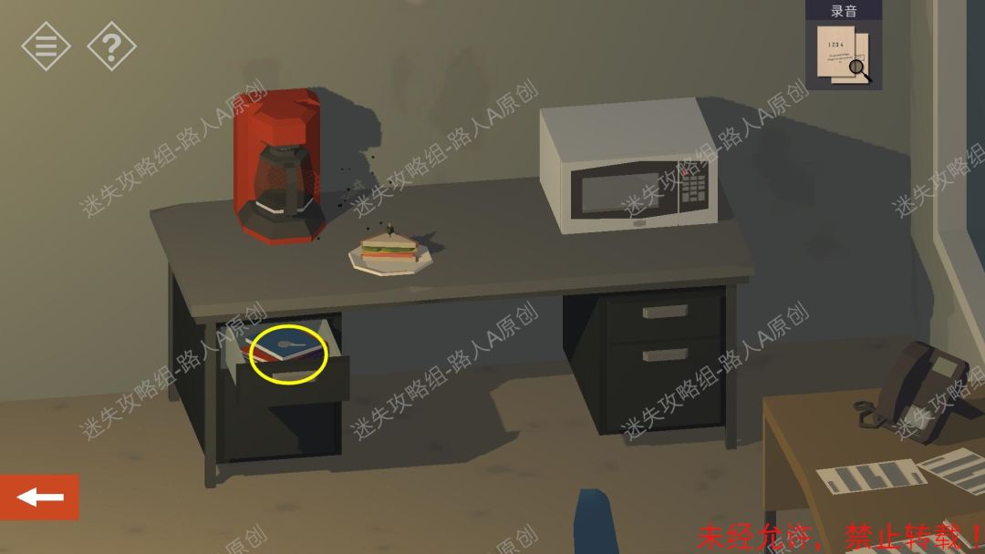 8.打开办公室里的房门(点击门锁打开),进入里间。9.点击座灯,打开照明,然后打开小桌子的抽屉,拾取【蜡烛】。9.1