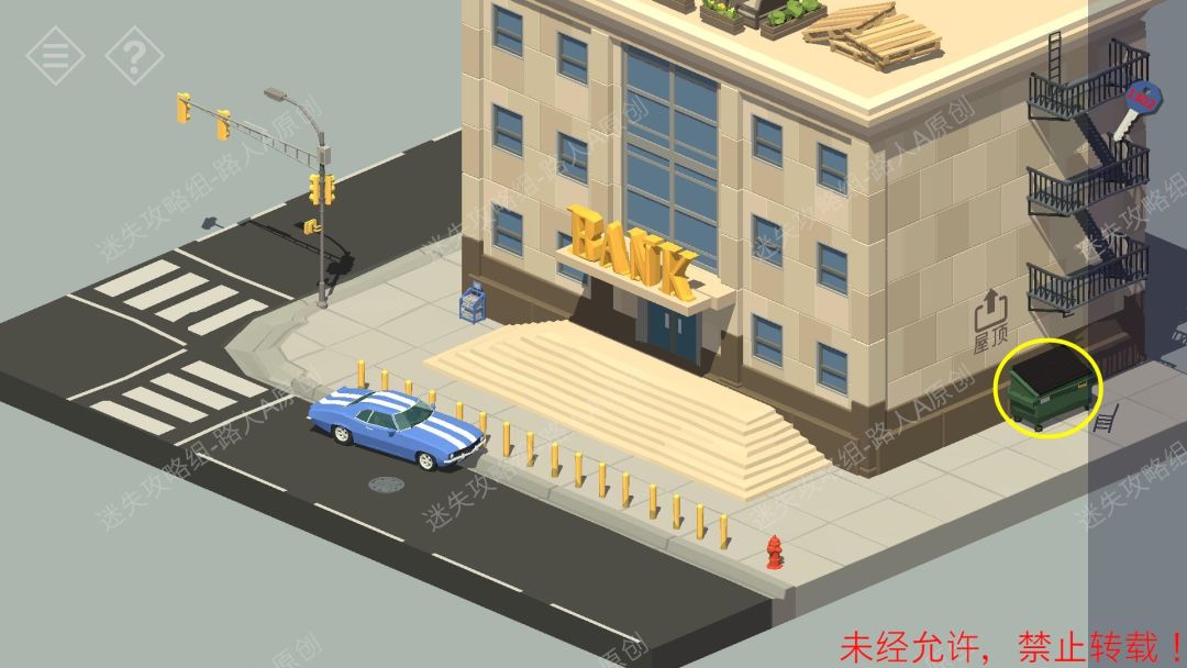 1.在银行大楼的侧面,推动垃圾箱,爬上屋顶。1.1