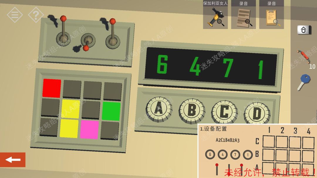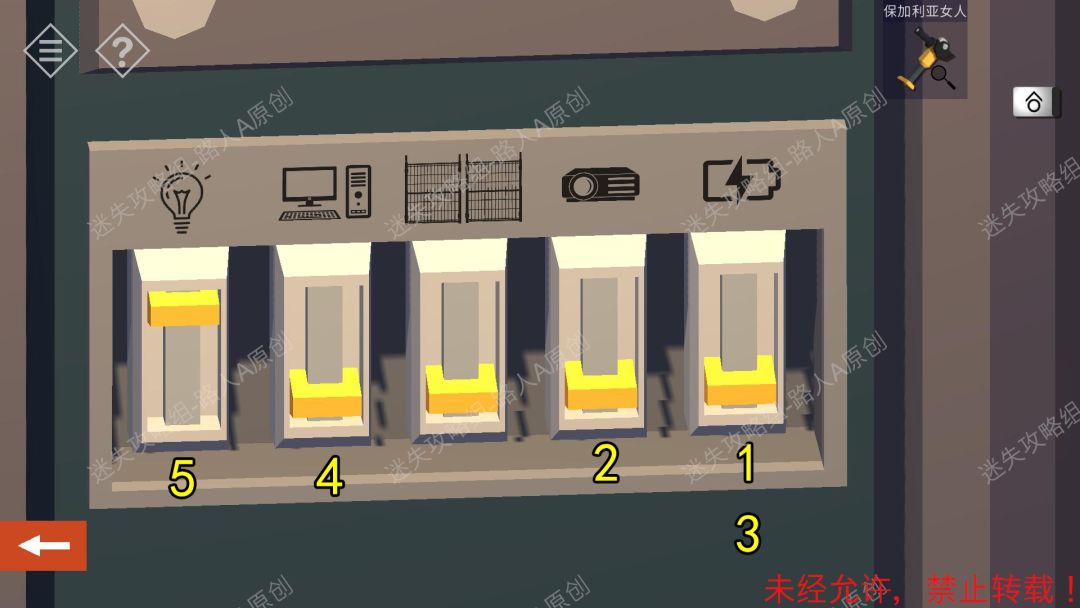 2.点击墙上的电箱,用【钳子】拔出螺栓,打开电箱。然后通过点击调整,开启所有按钮。(下图的点击步骤是从没有点击过的初始状态开始,如果已经点击过,可能不适用。)2.1
