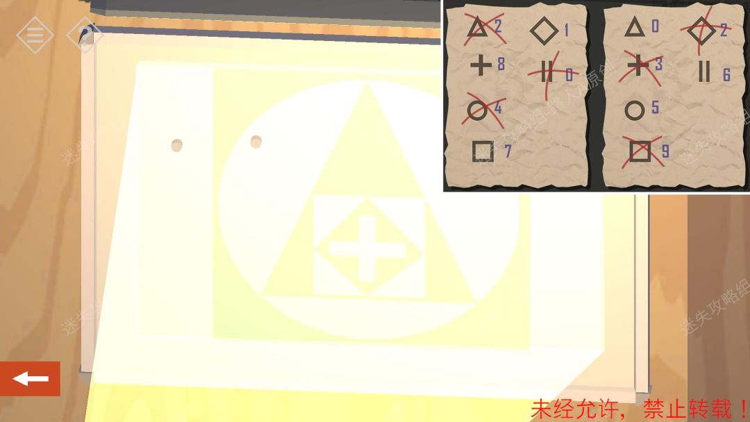 4.观察投影的图形,从外到内是正方形、圆形、三角形、正方形、菱形、十字。然后在【纸条】找到图形对应的数字,得到密码【750718】。4.1