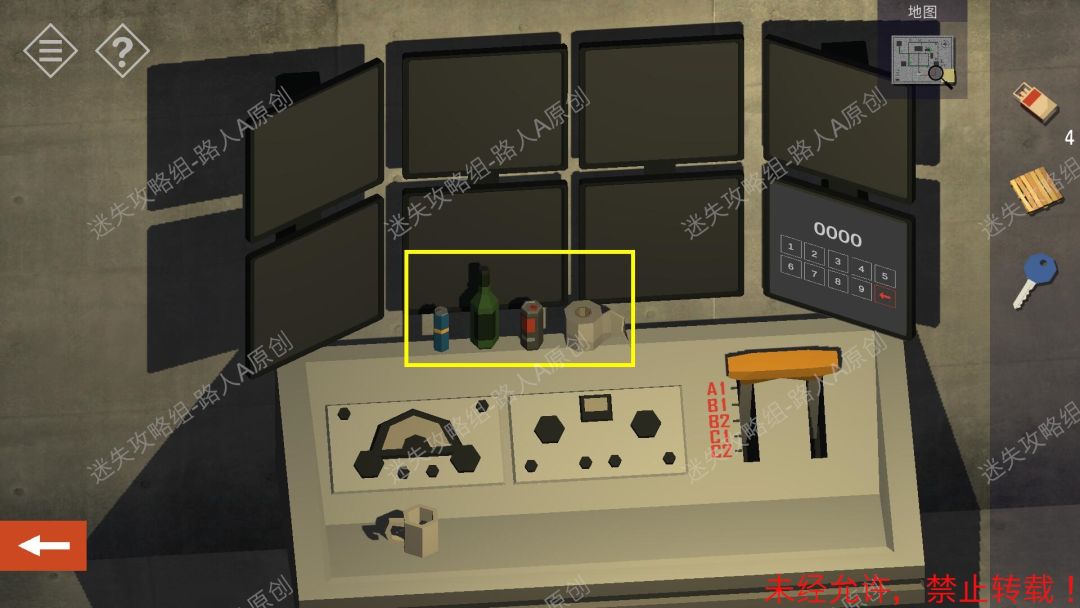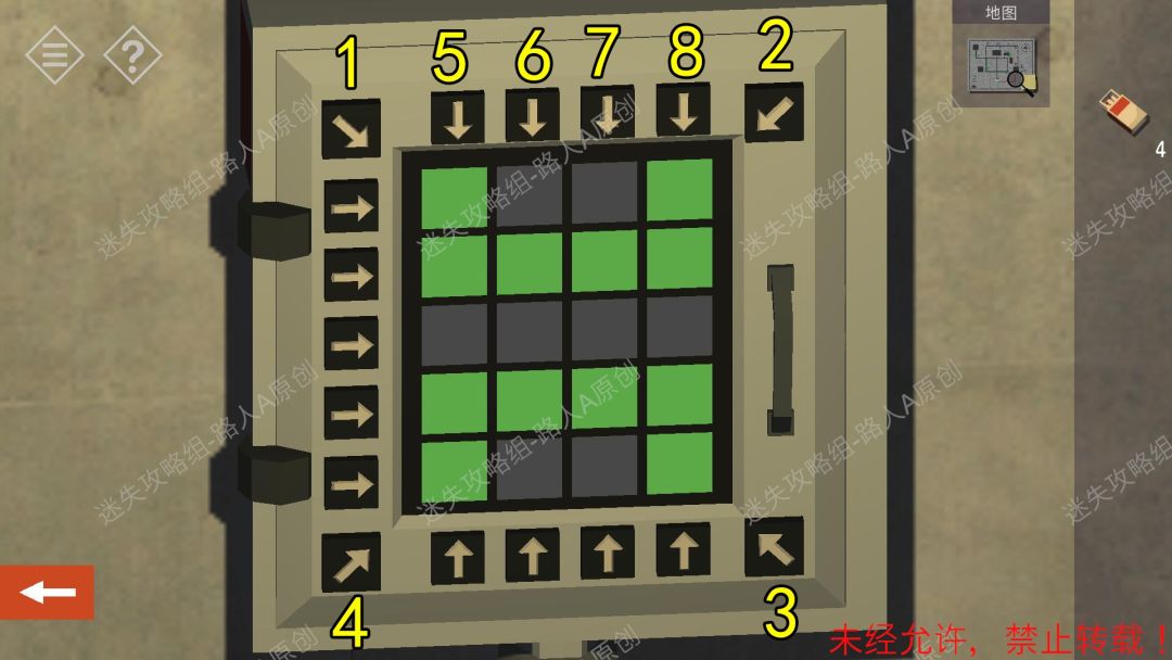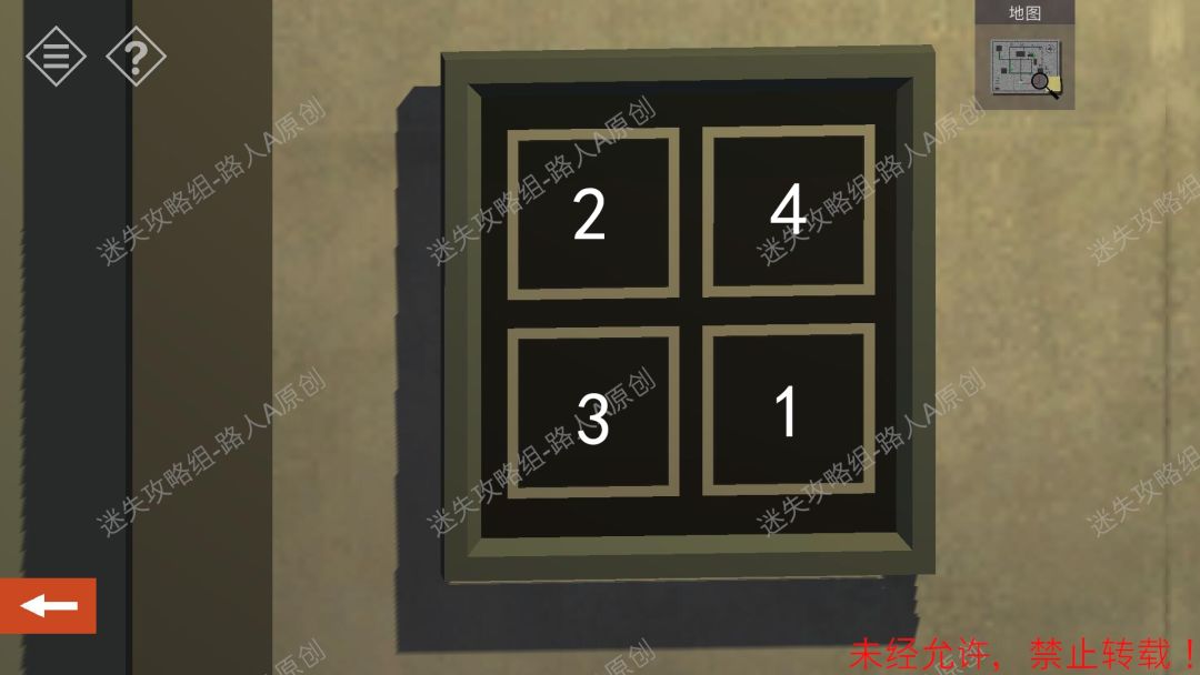 2.参照地图,找到储藏室,点击门边的密码锁,把4个方格点击为白色,解锁门。2.1