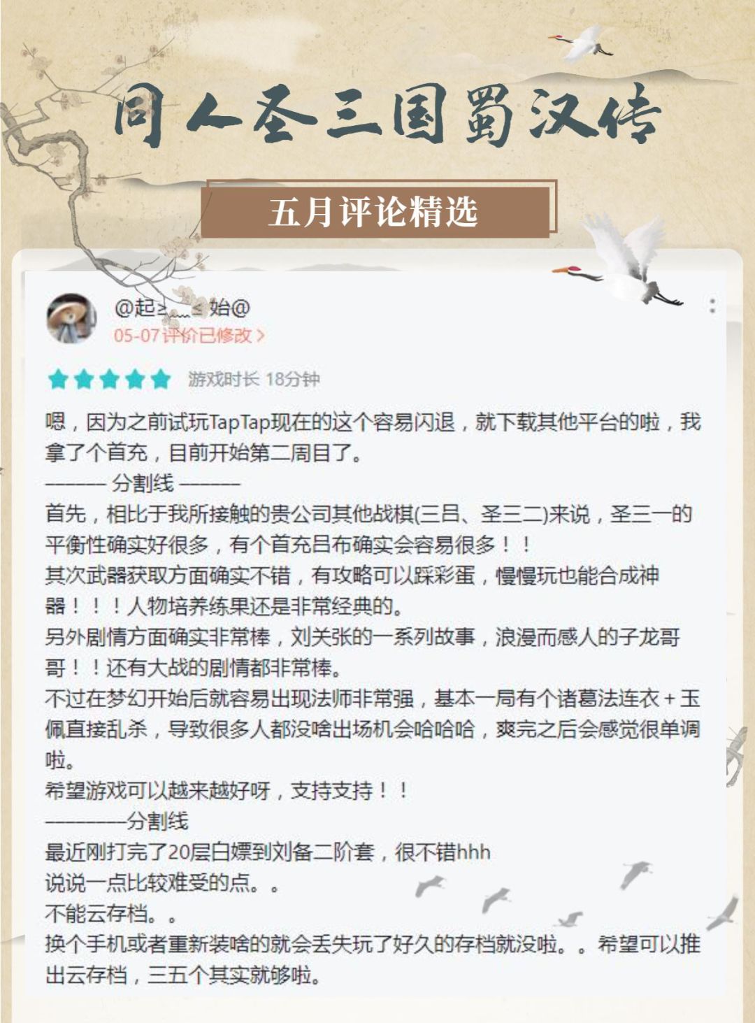 每个月初,我们都将挑选出上月的精选评论,并展示在Tap社区,欢迎各位主公前往评论区(https://www.taptap.com/app/177887/review)进行评论发表,大胆吐槽,尽情说出你们的想法及建议~