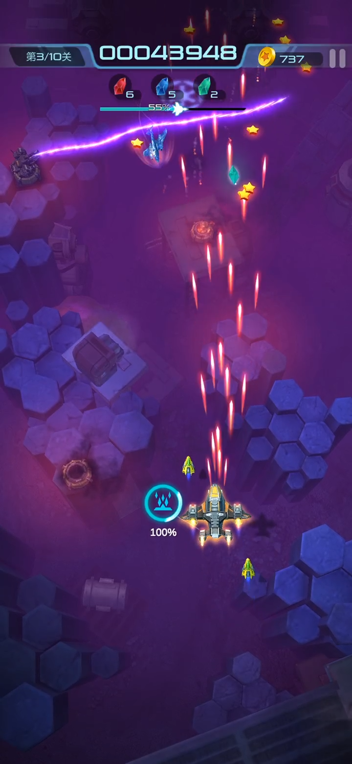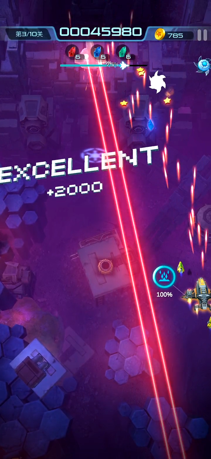 随着关卡深入,发现扭曲虚空中的敌人并不简单,它们不仅加强了常规攻击,而且增加了地面固定防御实力。在地面不仅增加了各种速攻火力数量,还增加了打出直线光弹链以及激光柱的地面防空火力,稍一不注意,就会让驾驶的战机中招。面对它们,战机需要在发现的第一时间,就需要集火清除,否则,它们将成为战场上的第一威胁。除此以外,敌人还增加了空中随机出现的激光线,战机一旦被擦到,会带来20%左右的损血,如果血量低甚至会直接挂掉。面对它们,并没有太好的办法,还是预先清理出走够多的走位通道,远离它才是上上策!
