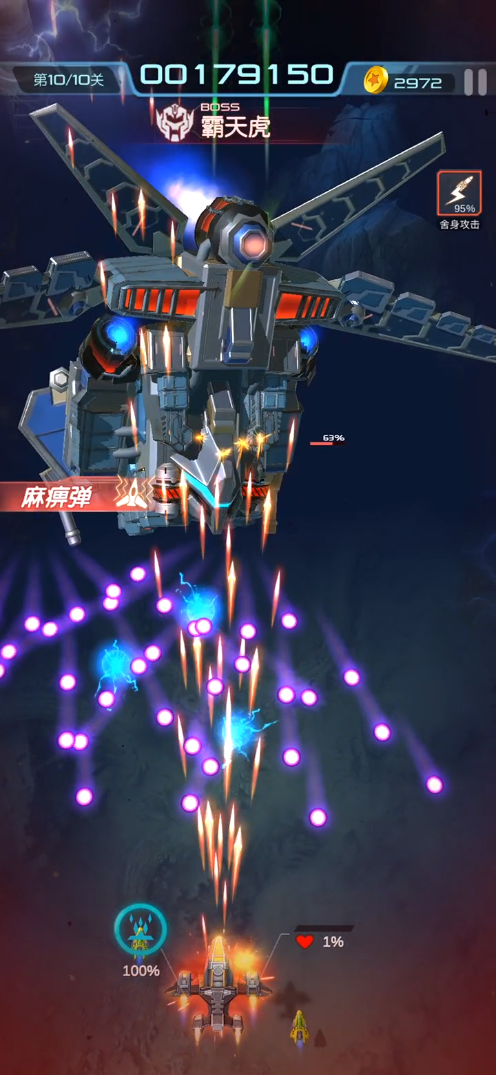 最后的关卡中,遭遇了实力强劲的霸天虎,作为被四大天王改造的强兵,它的实力不是盖的。它会打出高度覆盖的弹幕,如果战机正好处于弹幕覆盖区,那么两轮内就可清空你的血量。还好,僚机发现了霸天虎的短板,只要我们第一时间贴着霸天虎的中上部身躯进攻,那么,这些霸天虎打出的弹幕,就将变为最美的烟花。果然,几轮过后,霸天虎被我们成功收服。