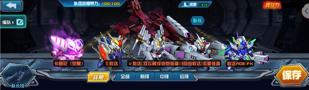 推荐理由:一般情况下,浮游炮系列队伍是由作为队长的统御式来担当前排,但一个队伍只能有一台大型机,将强自流星加入浮游队后,自然就没法再上统御式了。所以,退而求其次将拥有不俗回复能力的AGE FX放置其中,来作为第一线承担绝大部分火力。