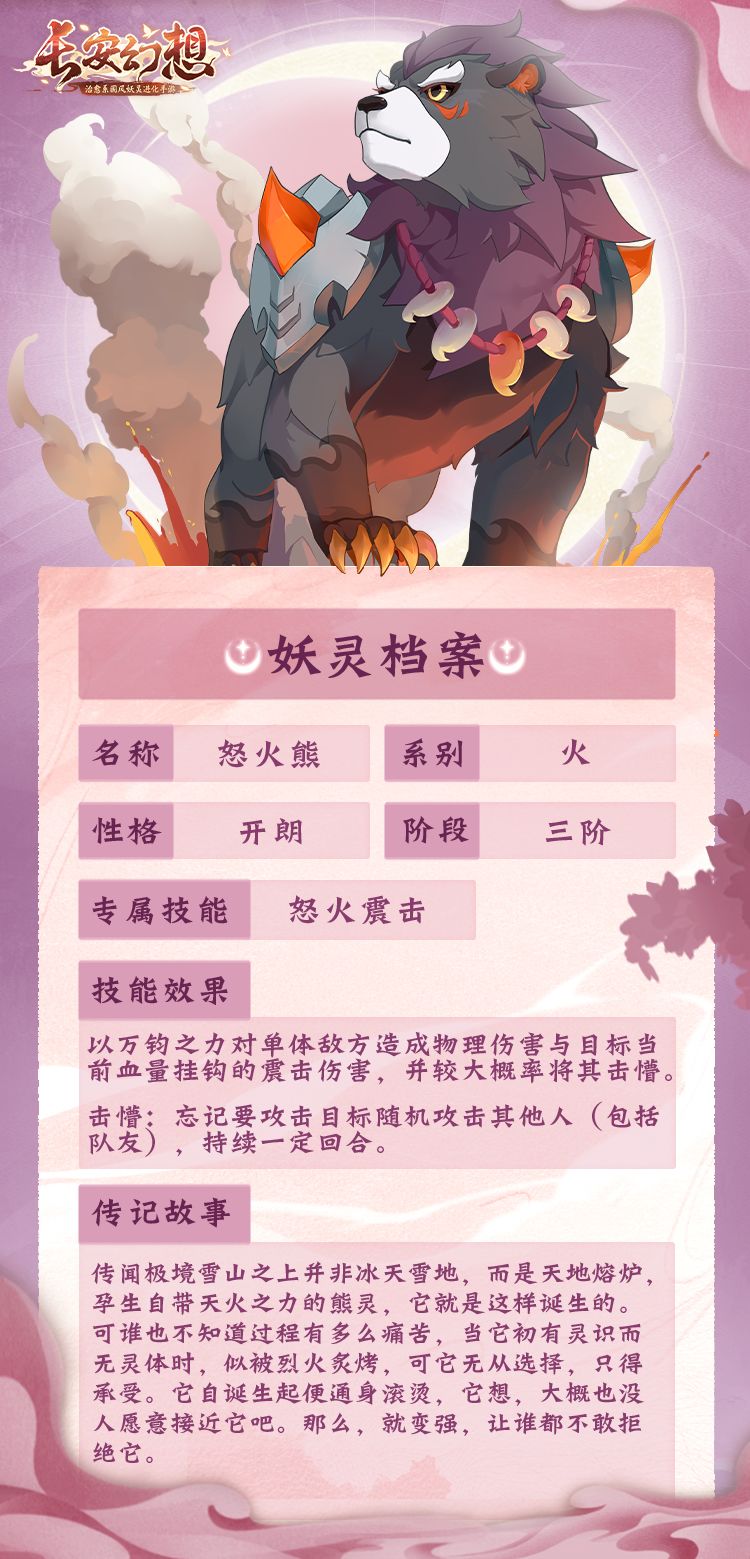 天生要强的怒火熊是熊族中的变异妖灵,它资质范围要比撼地熊要更加优秀,同时专属技能的效果也略有不同。怒火熊的【怒火震击】触发击懵效果的概率要更高,在战斗中更加容易实现单点控制效果!