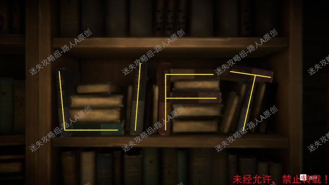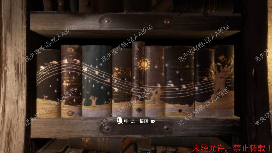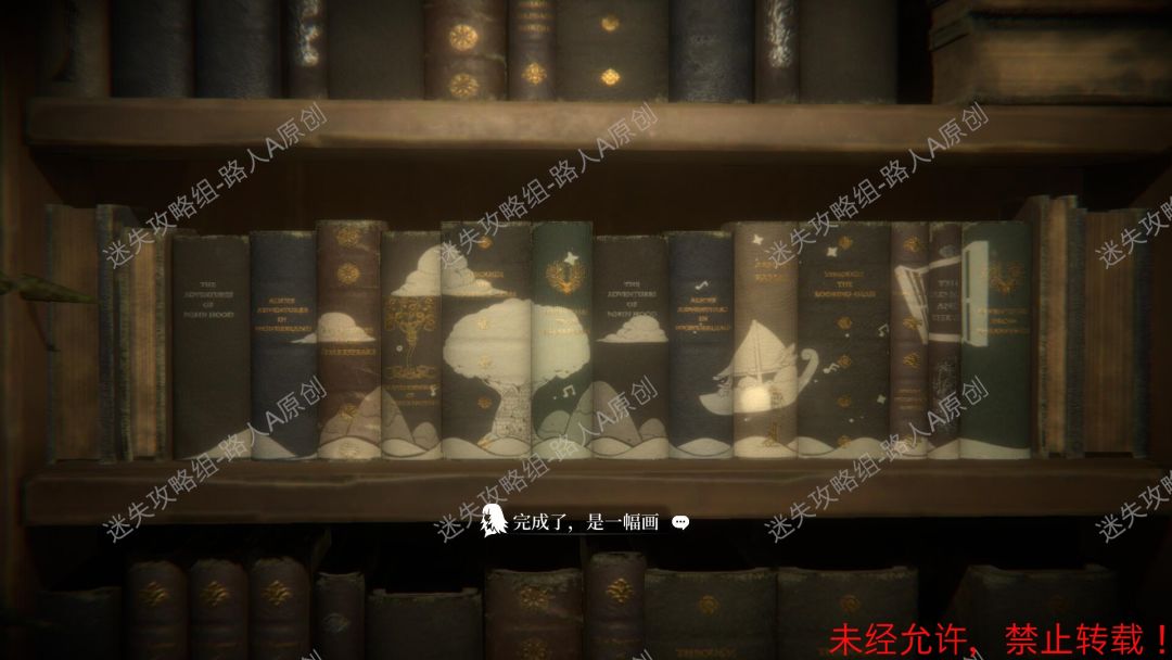 14.调查书架上的黑暗区域,找到暗格。(完成书架的书本图案排列谜题,并且在收藏室获得萤火虫提灯)
