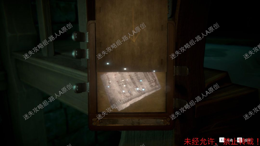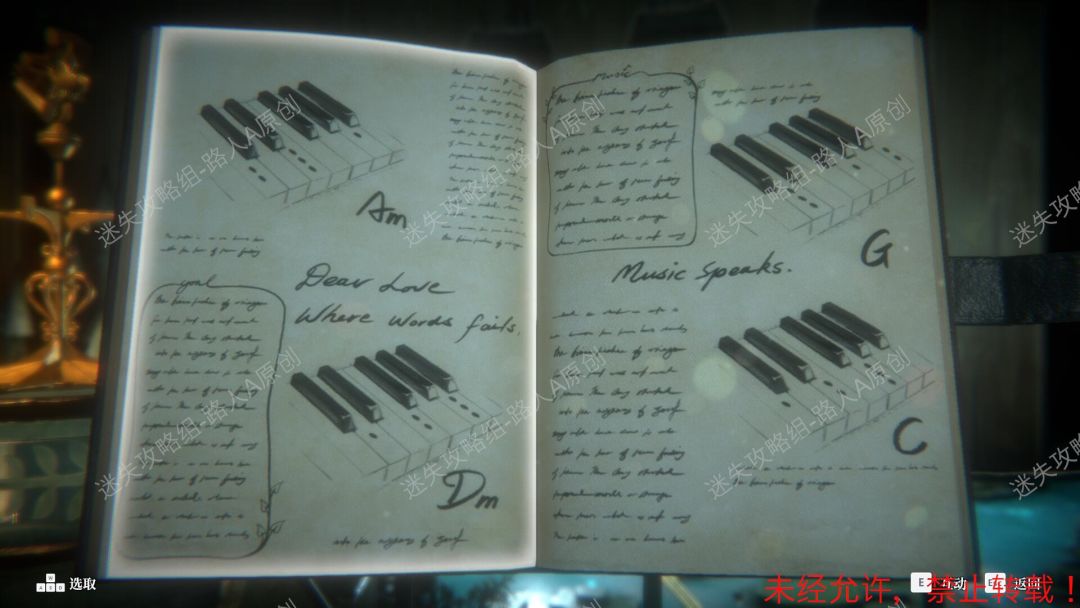 25.调查楼梯上的小挂画,按顺序倾斜小挂画打开锁:左左右左右。得到乐谱。25.1