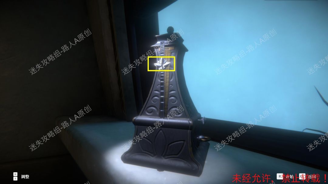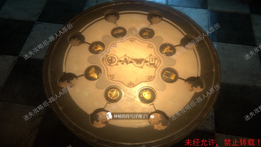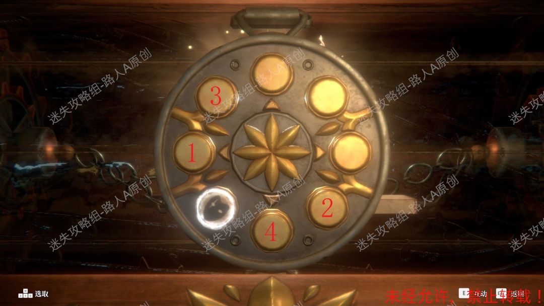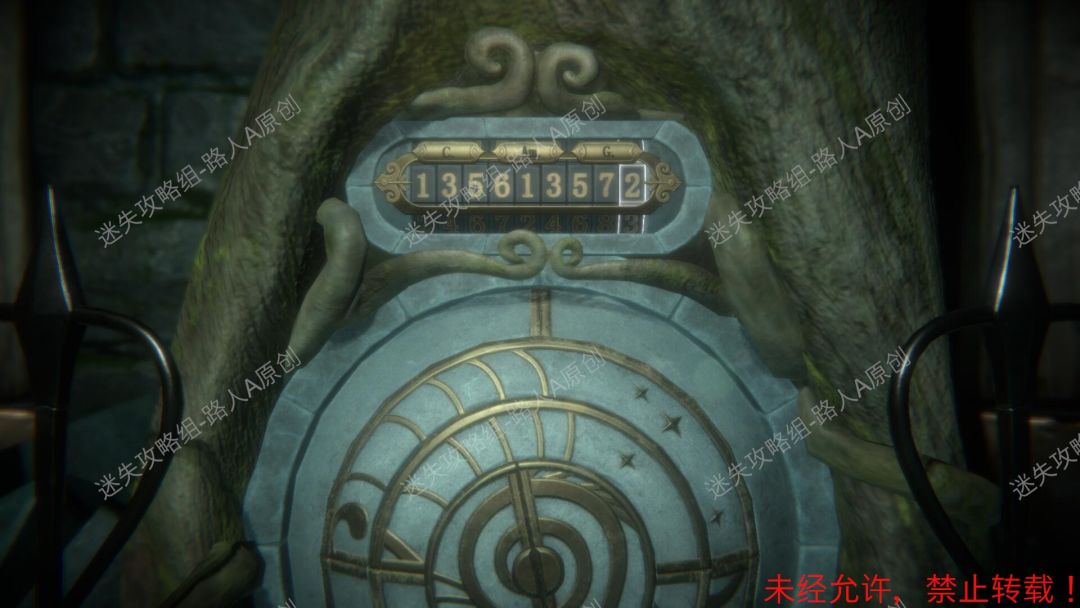 地下室:中央指挥家往左走(水位升到最高),完成墙上的转盘谜题。