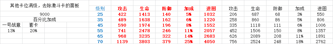 为减少了表格数量,所以很多卡组搭配我都没放,比如幽灵公主1号位置,套牌属性是暴击啊等等,这些并不影响最终的结论,因此我放上来的表格是,不含激斗卡时基础面板9000攻击(肯定低了,不影响最终结论),一号位13%攻击,套牌20%攻击(同样不影响最终结论)。