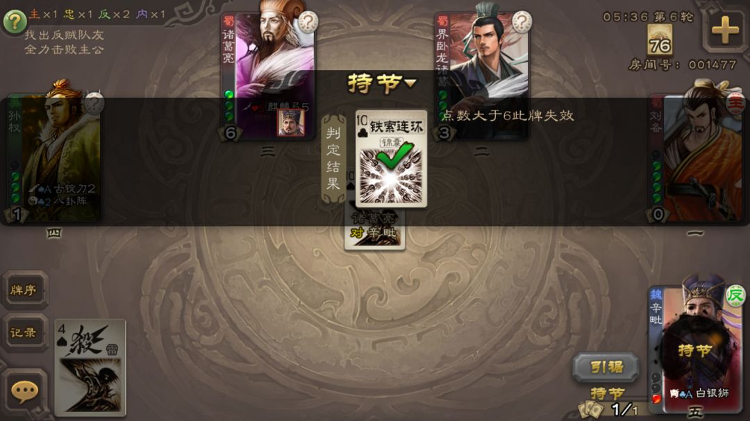 4、判定点数一定得大于6,所以小于或等于技能都失效,这时候配上个改判型队友,真的可以出现滴血不掉的场面,只不过改判的队友现在都跟不上节奏了(司马懿、张角这种)