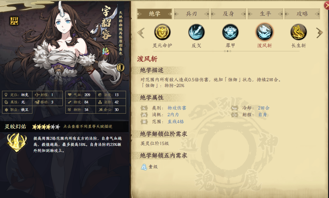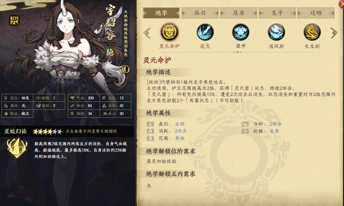 宇韶容定位光系铁卫,技能设置上也是基础的的回复+驱散技能,作为光盾来说质量合格,但作为绝品光盾来说质量略差,而且自身没有战阵,重要性又被砍了一截。