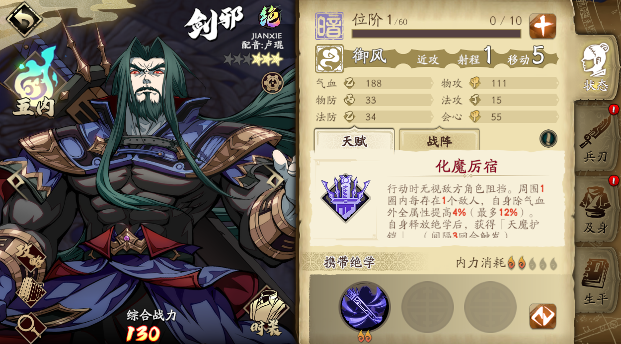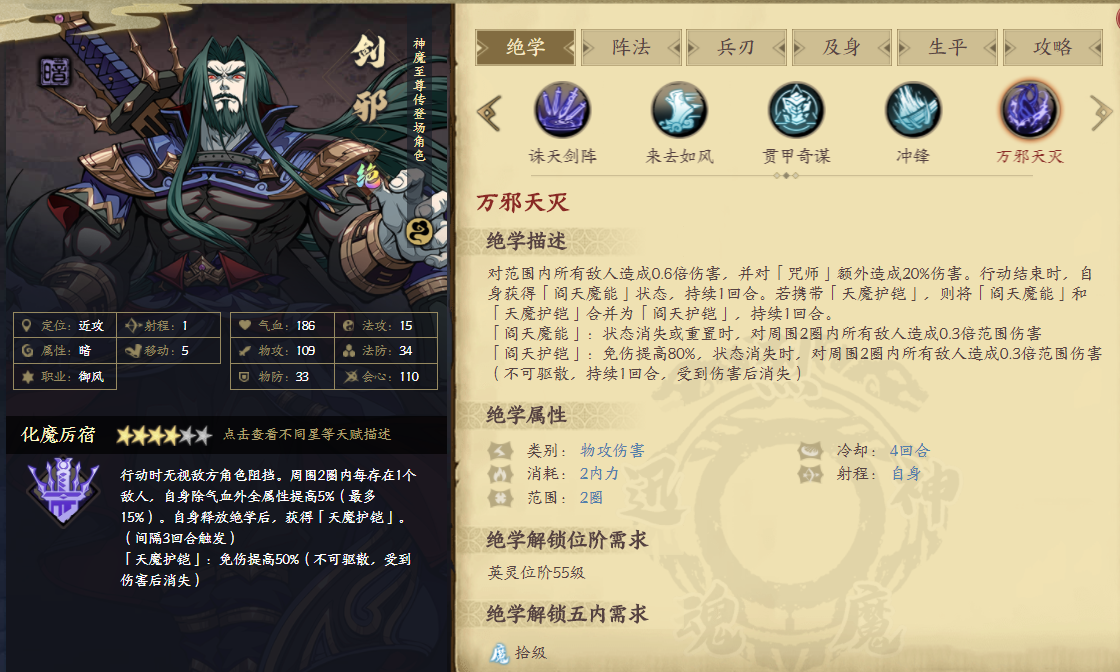 天赋的质量挺高的,可以全属性提升,而且特有的免伤也让剑邪作为一个御风有着更高的生存。不过,4星的剑邪需要间隔3回合才能触发,6星也要间隔2回合触发,低星低练度的剑邪可谓是既没有伤害也没有生存能力(毕竟剑邪的伤害是和生存直接挂钩的,不然怎么冲脸)