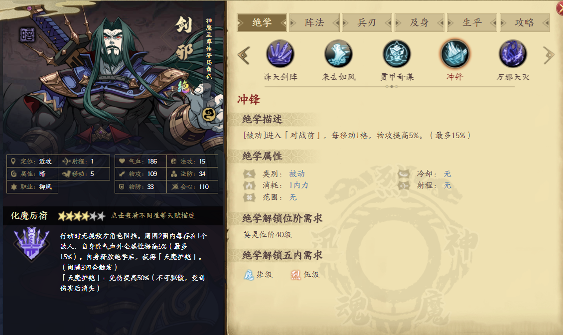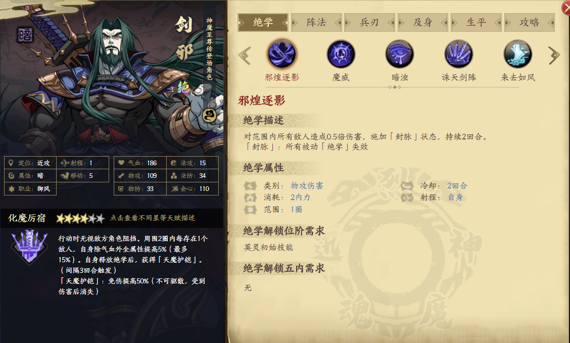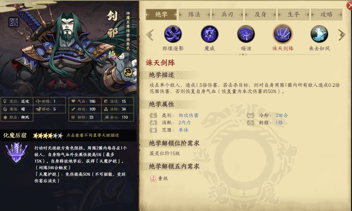自身自带一个战阵,需要剑邪+暗系+冰系,范围2圈内的敌人会增加我方的伤害,最多15%。这个战阵算是黎幽暗系大阵的一个替补阵,可以减少队伍中暗角色过多的压力。