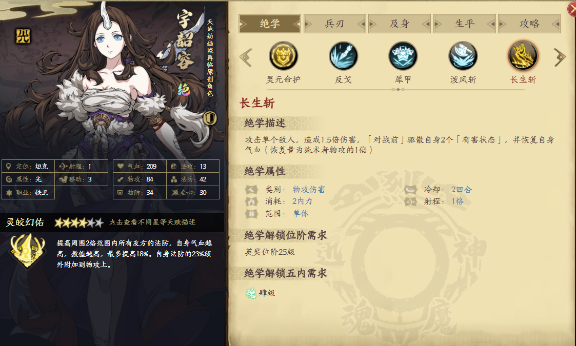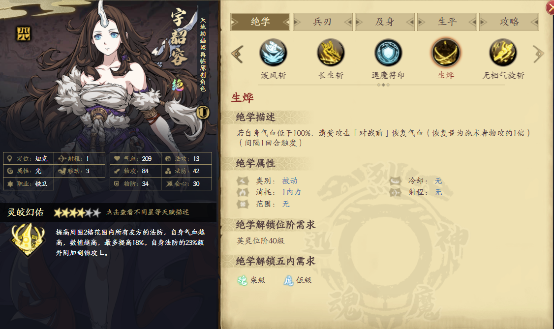 宇韶容的核心回复技能,浏览一下宇韶容的天赋和技能,她是没有太多免伤和加防技能的,作为宇韶容的回复技能可以保证最基本的生存。不过,恢复量为物攻的1倍,只能说够用却不充裕,如果改成法防的话估计宇韶容的生存又会上升一大截。