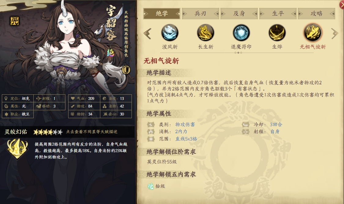 这是宇韶容救急的一个技能,不得不说,这口奶是真的足,可以在一定程度上降低奶的压力。3回合冷却,4点气力值释放,实在是太鸡肋,如果你去观察一下现在绝品角色会发现只有宇韶容和大师兄两个是4气力值(但大师兄协力也算一次)。或许策划是这样嘀咕的:“你看吧,你可以拿着宇韶容输出呀,一回合打一下扛一下不就2点气力了吗?”。