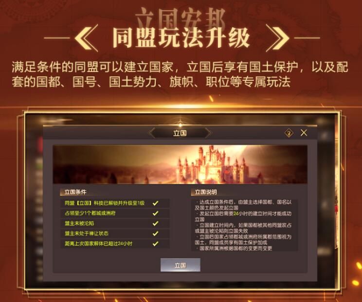 新赛季中满足条件的同盟均可以建立国家,立国后享有国土保护以及国都设置、国号设置、国土势力显示等一系列配套设定。立国条件也并不复杂,只需要同盟占领至少1个郡城或洲府,解锁科技中的“立国”,同时盟主未被沦陷、未处于禅让状态、立国CD冷却完毕,既可以建立国家。