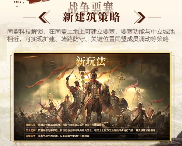 通过同盟科技解锁后,即可在同盟土地上建立战争要塞,战争要塞拥有类似中立城池的耐久与功能,君主可在战争要塞周围建立大型拒马、鼓楼等策略设施。