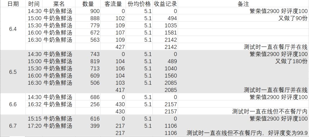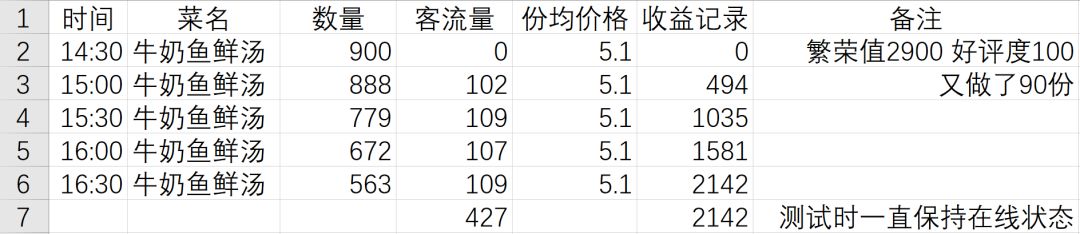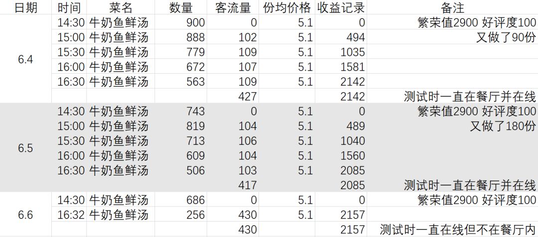 目前优先研究流行菜buff,考虑6.5设计实验为繁荣值2900好评度100下14:30~16:30营业单独出售牛奶鲜鱼汤,半小时记录一次数据,全程保持屋内在线状态。如果实验顺利,那就能得到流行菜buff的具体加强数据。