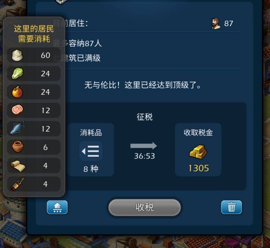 我们根据下面居民需要的消耗(点击住宅,信息里面的消耗品),根据上面那个市场价格,再根据下面的居民消耗来计算,需求价格只要不高于市场总价就是不亏的。
