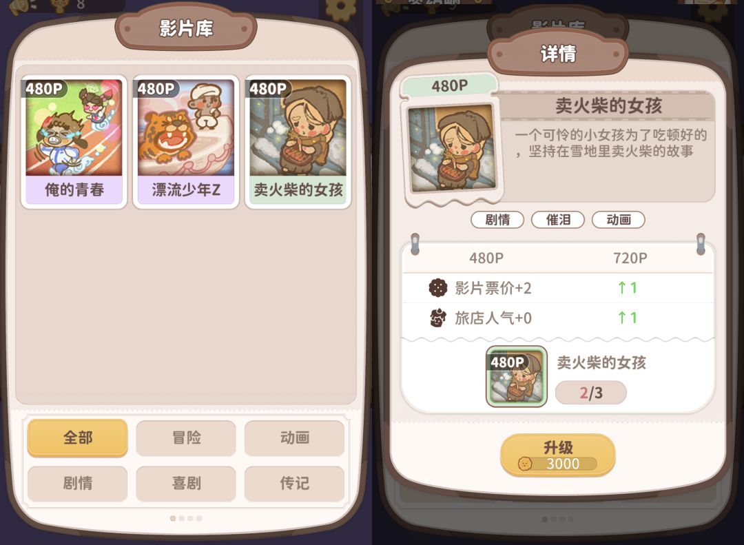 影片库用于陈列升级解锁的影片,按照电影类型划分为科幻、奇幻、动物等,可以通过分类查看影片详情及作用。(类型标签为满足客人观影期待的关键)
