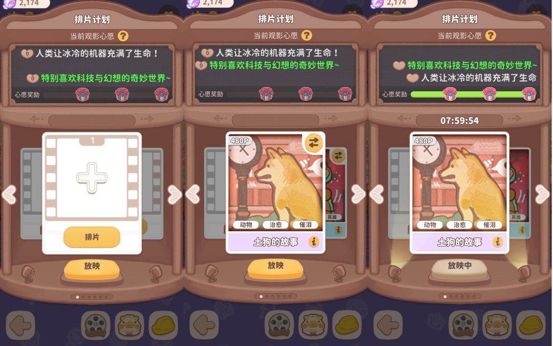点击排片加入你想放映的电影,解锁更多放映栏可同时放映多部影片。根据客人观影心愿弹幕并查看对应影片标签,选择合适电影放映可获得心愿礼包奖励,同类型等级越高的影片可获得更多收益,最后点击放映按钮即可开始本轮排片计划。