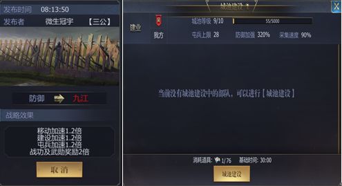 (PS:城池建设非常重要,城池建设度达到一定值城池等级会提升,同时防御能力及采集速度也会同时提升)。