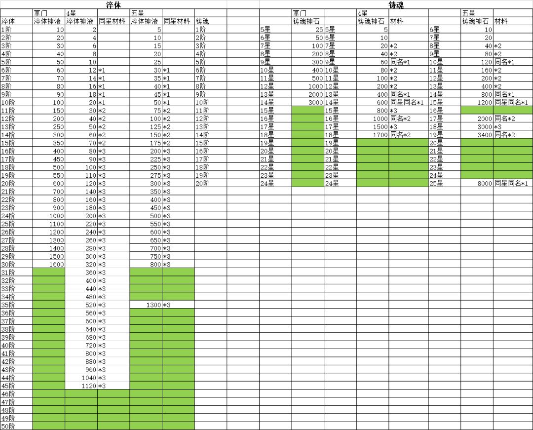 淬体缺:31阶~34阶、36阶~50阶 铸魂缺:16星、20星~25星