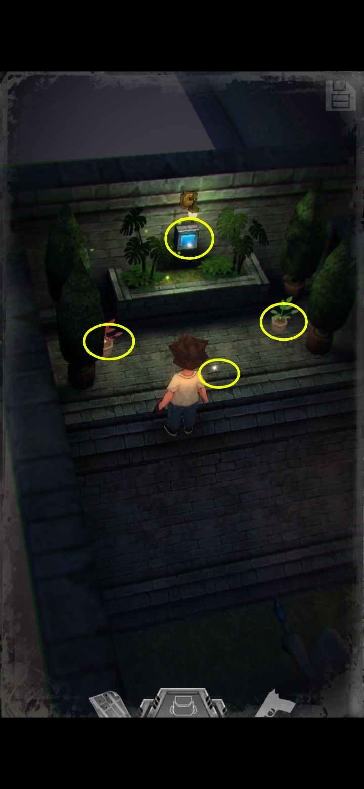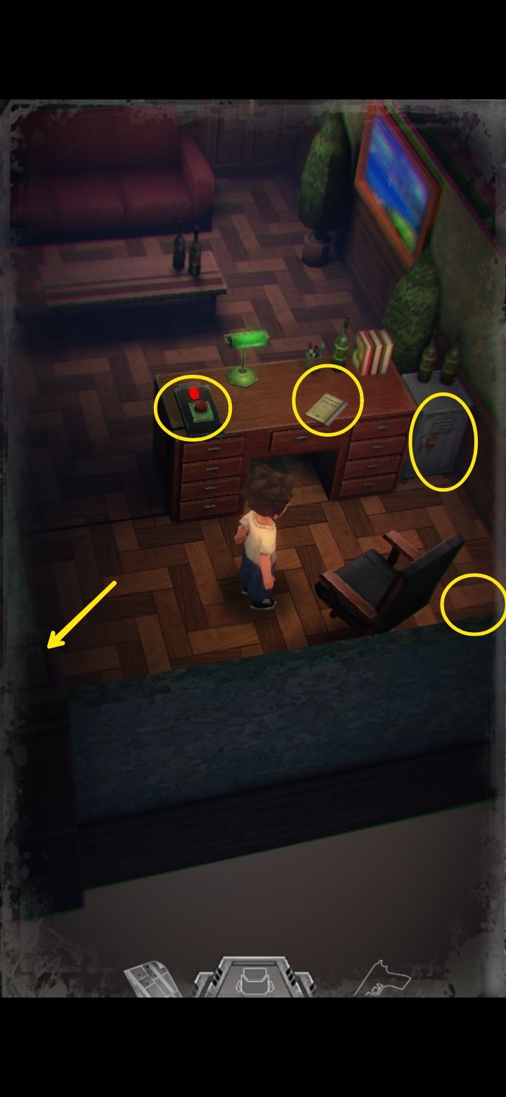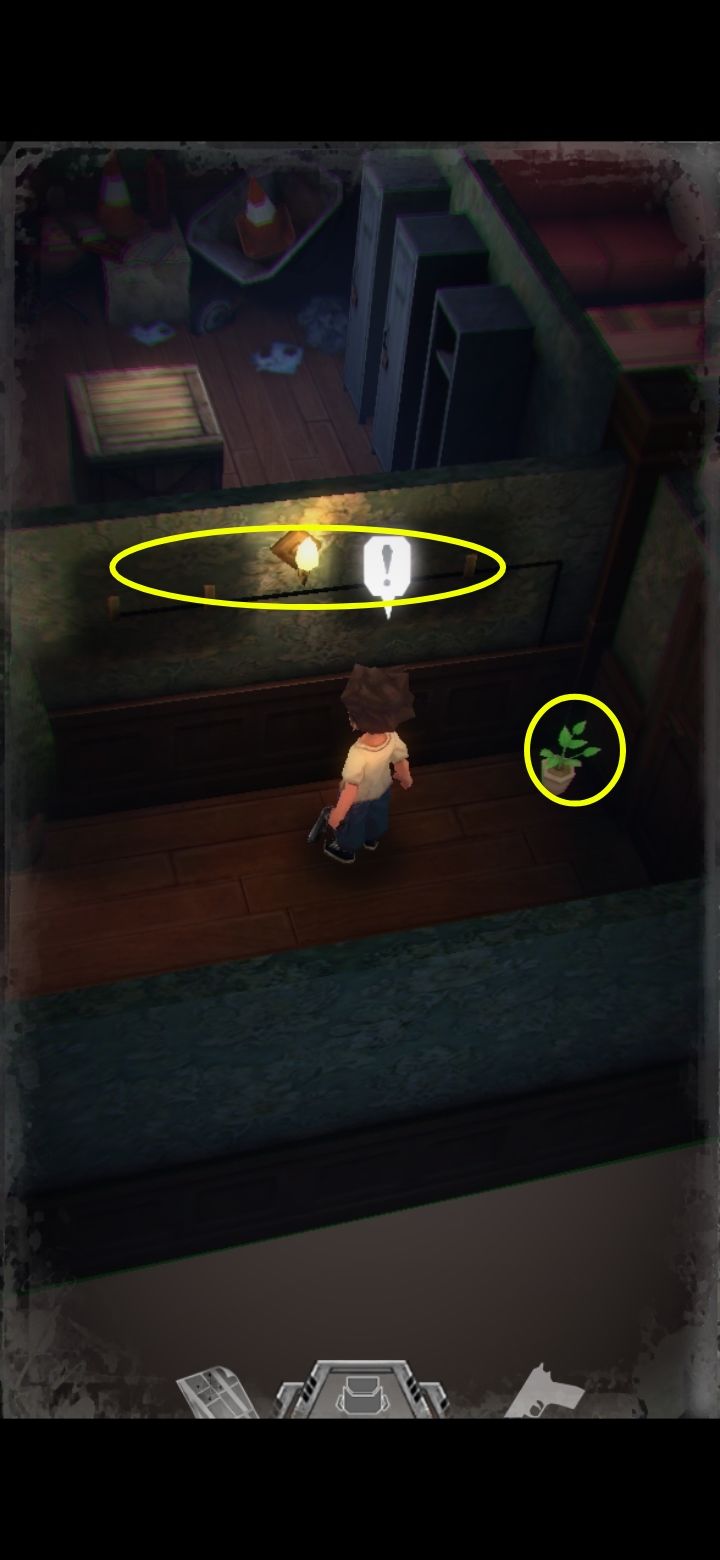 左边有一棵小疗伤药,上面的机关需要四角手轮,管理员日记里提示手轮在洗手间,办公室里的酒瓶不让人动(与密码有关)。地上坐的是个怪,这游戏里除了主角任何人形生物都是怪,所以不要在他旁边晃悠的时间太长,尽量最后拿箱子上的钥匙,拿了怪会站起来咬你,不要惊慌,拿完跑出去就可以。