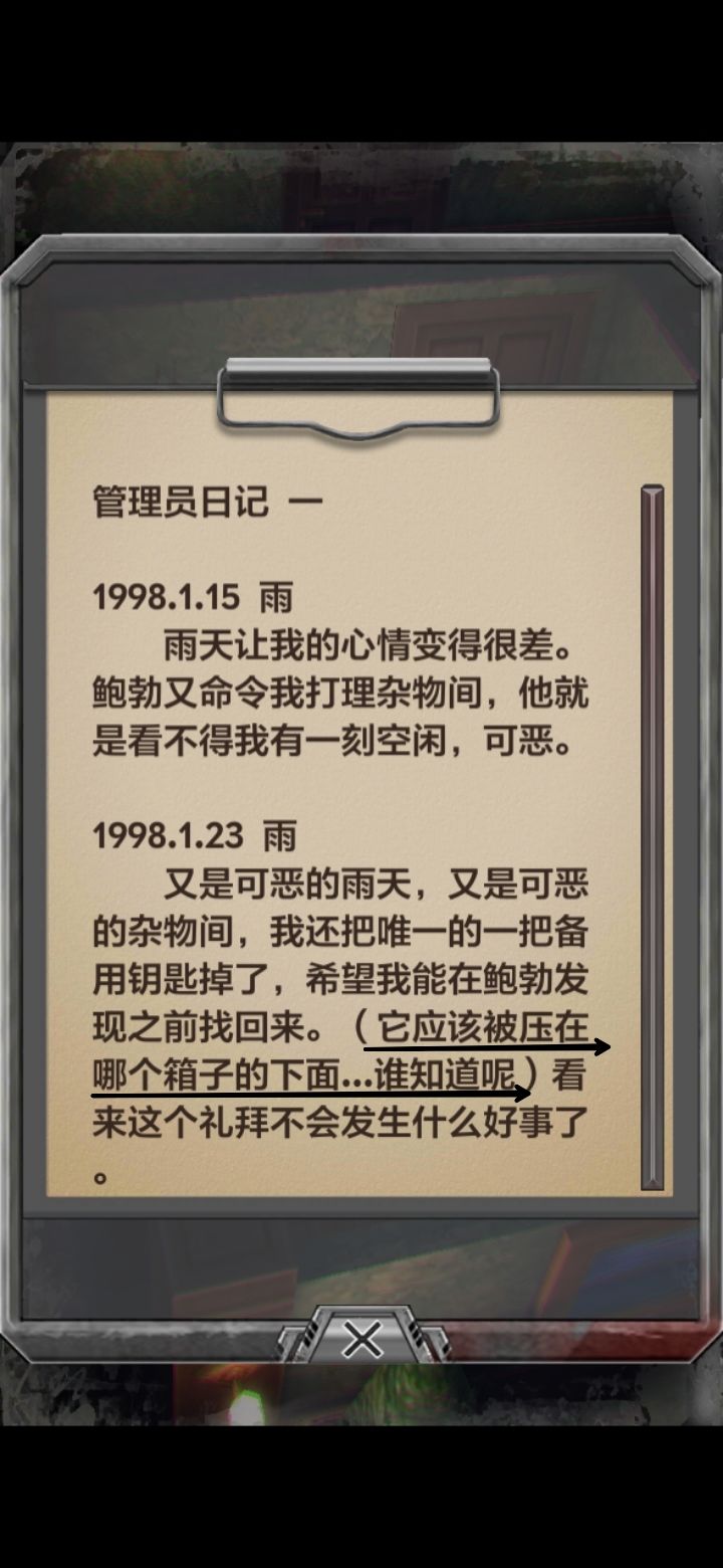 选择读取管理员日记,获知部分剧情和提示,得知钥匙压在哪个箱子下面。