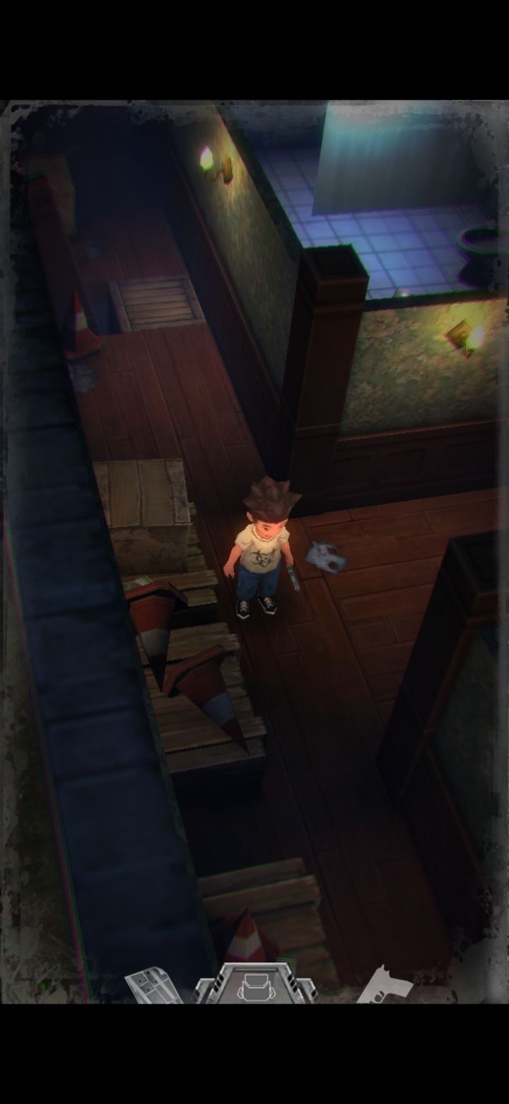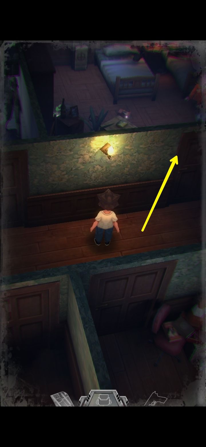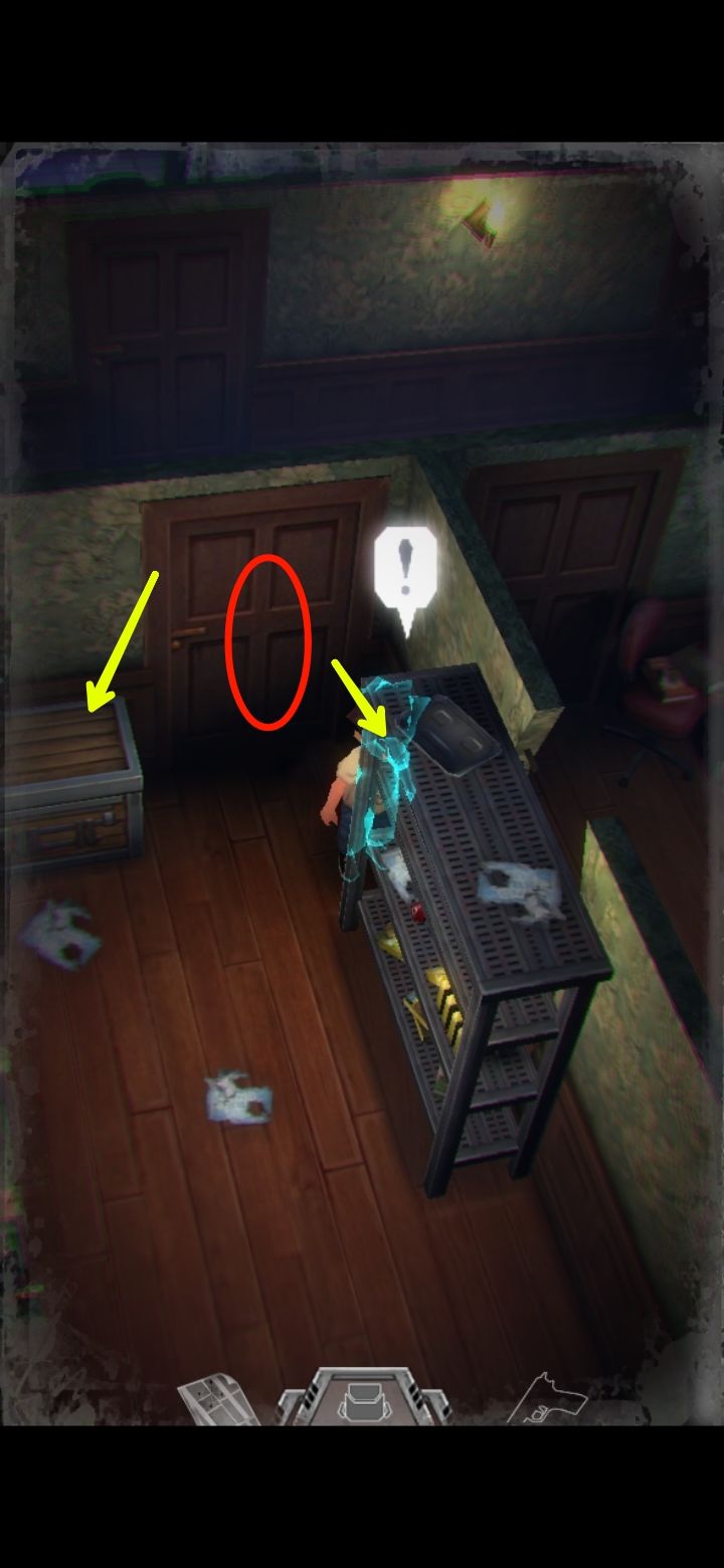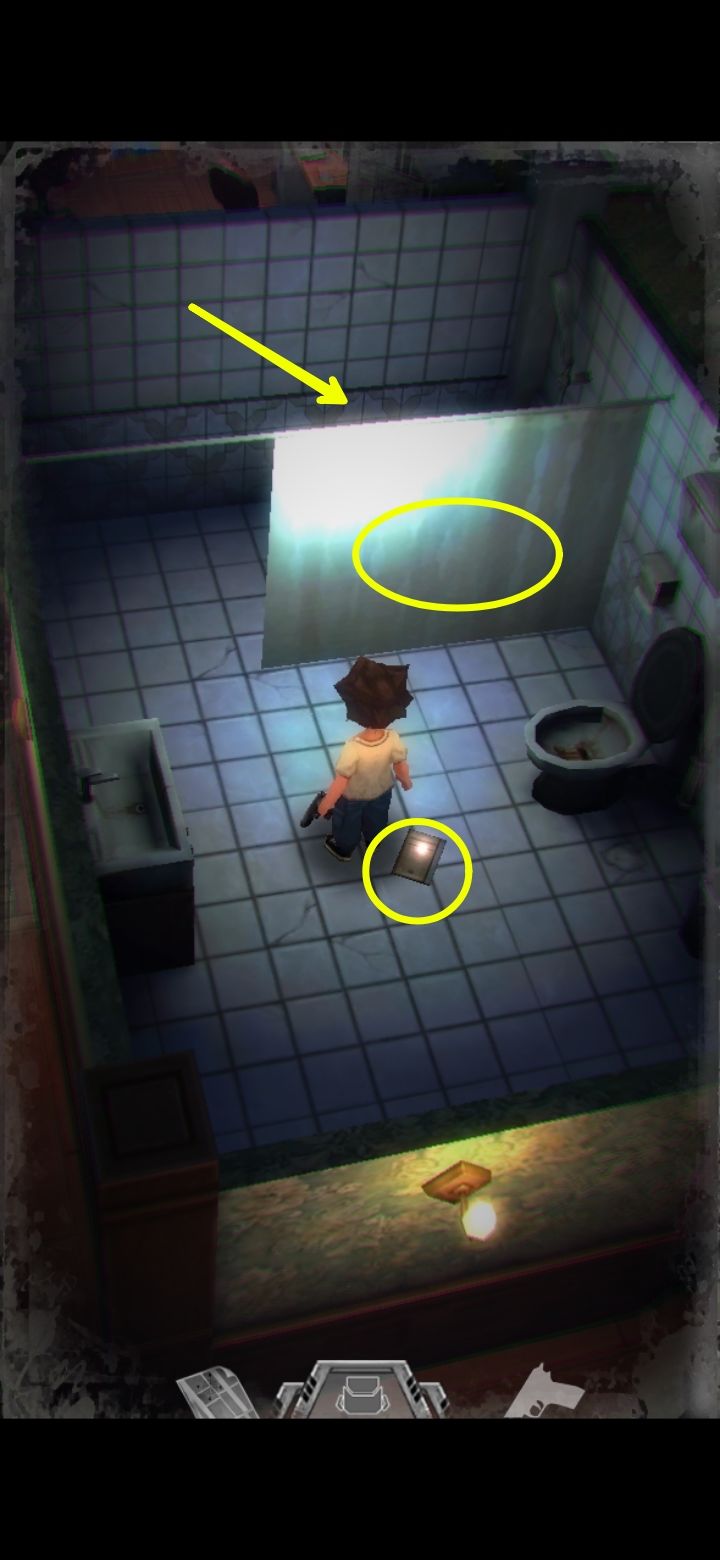 打怪技巧:射击时可以长按屏幕瞄准,然后一直轻点射击,或者点击一下屏幕下方的手枪标志瞄准(再次点击就会取消瞄准),然后多次点击屏幕其他地方进行射击,或是直接点击怪物进行手动瞄准。(瞄准后可以一直射击,不用瞄一次打一次,移动会中断瞄准状态,需要再次瞄准才能射击)箭头指的地方有一扇门,走进去。有怪出来,不要惊慌,拉开距离以后瞄准(我推荐点下方的手枪标志),射击,近距离被抓到会掉血,不贴脸就没事,非常简单,怪“啊!”的惨叫一声之后就不要再开枪了,已经死了,注意节省弹药。有的怪死了以后会掉亮闪闪的代币,记得踩踩尸体。