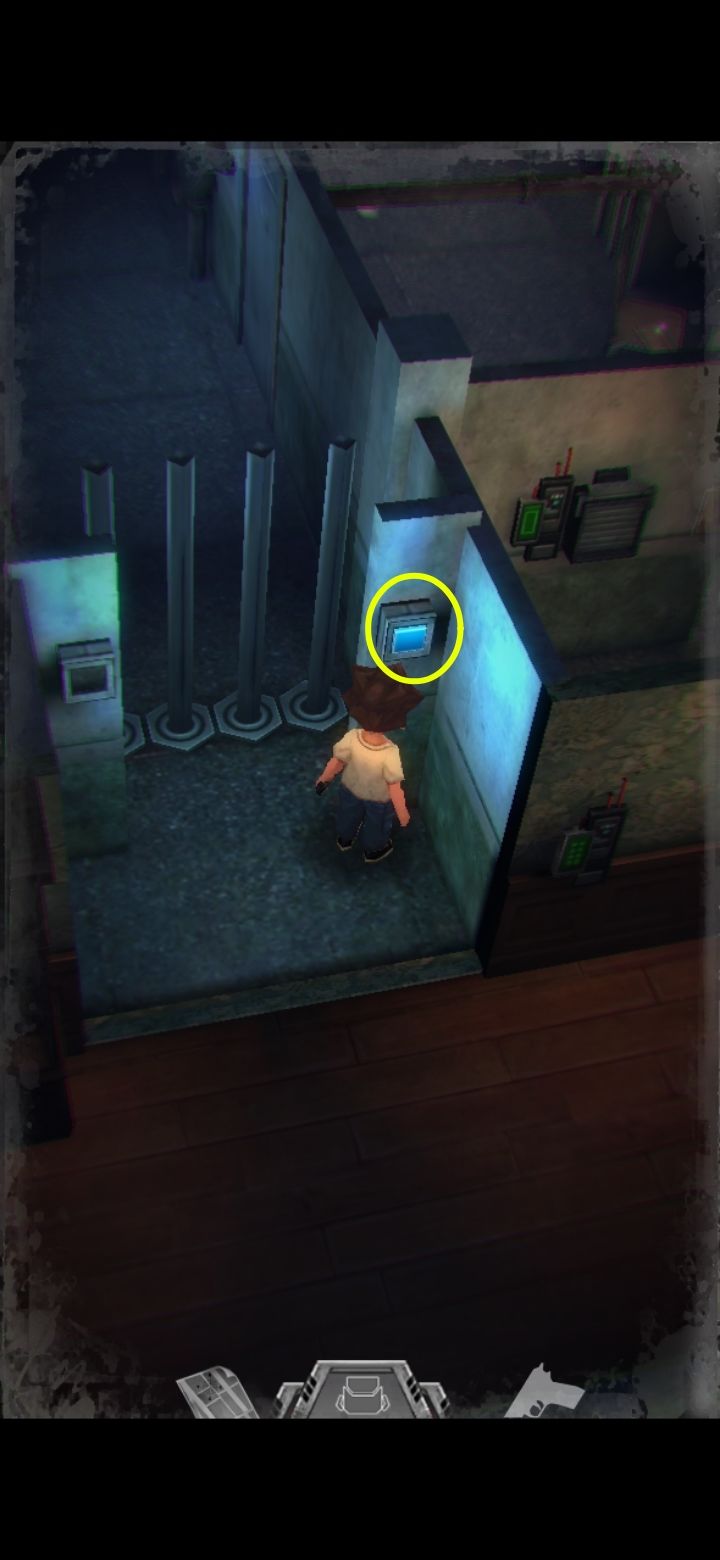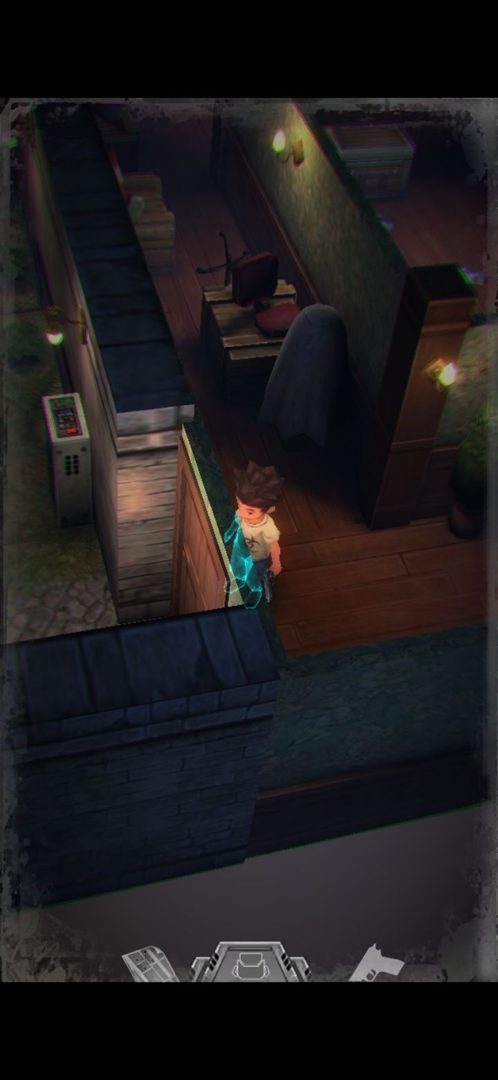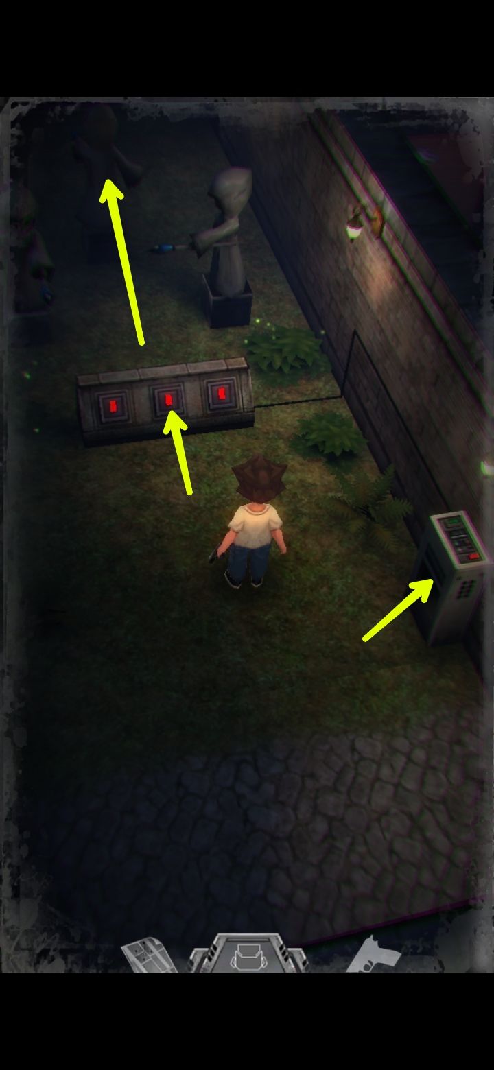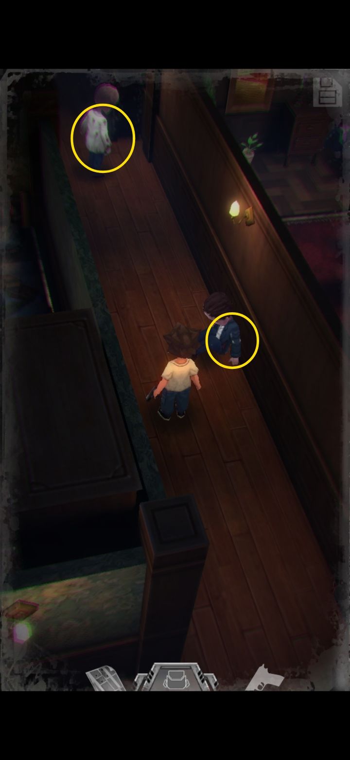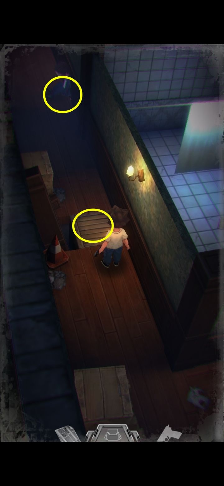 打怪技巧:射击时可以长按屏幕瞄准,然后一直轻点射击,或者点击一下屏幕下方的手枪标志瞄准(再次点击就会取消瞄准),然后多次点击屏幕其他地方进行射击,或是直接点击怪物进行手动瞄准。(瞄准后可以一直射击,不用瞄一次打一次,移动会中断瞄准状态,需要再次瞄准才能射击)箭头指的地方有一扇门,走进去。有怪出来,不要惊慌,拉开距离以后瞄准(我推荐点下方的手枪标志),射击,近距离被抓到会掉血,不贴脸就没事,非常简单,怪“啊!”的惨叫一声之后就不要再开枪了,已经死了,注意节省弹药。有的怪死了以后会掉亮闪闪的代币,记得踩踩尸体。