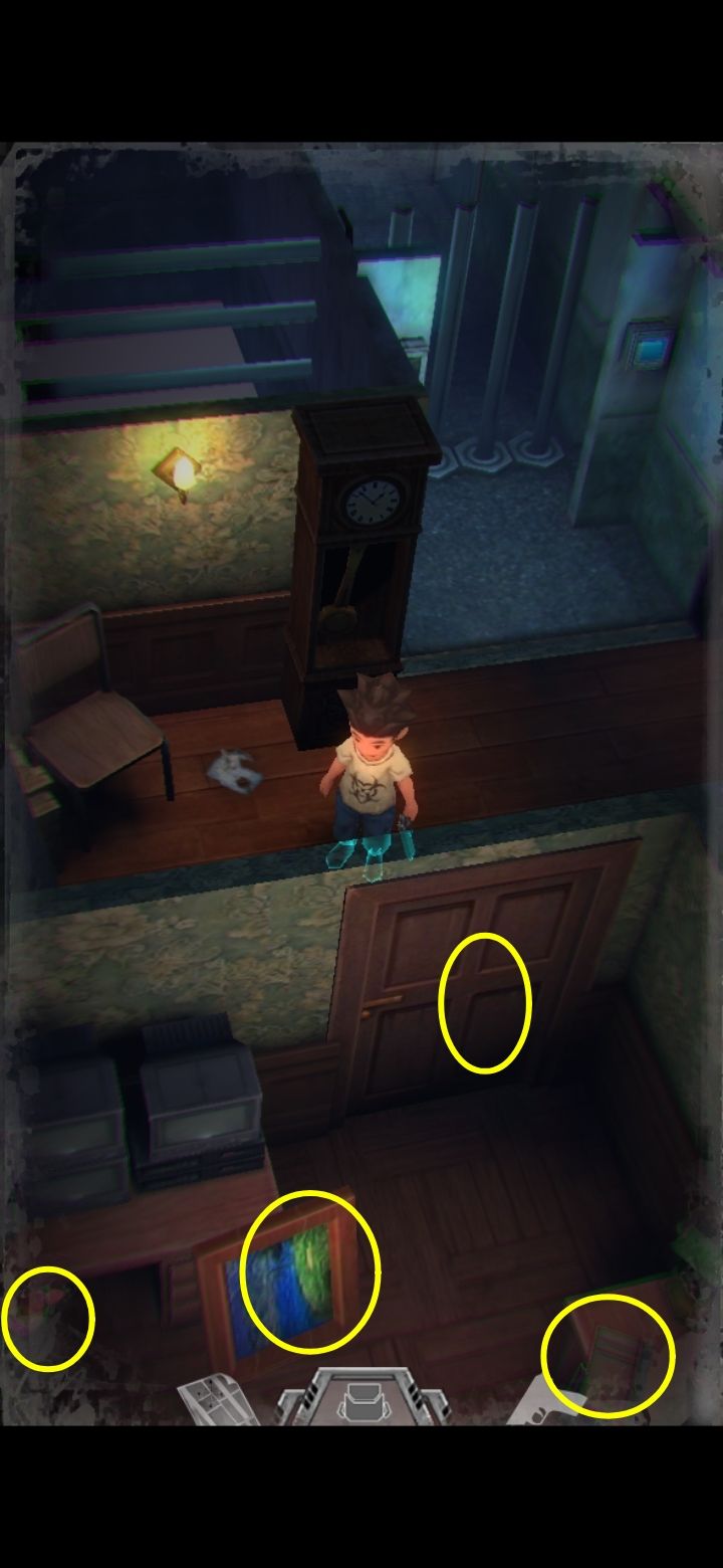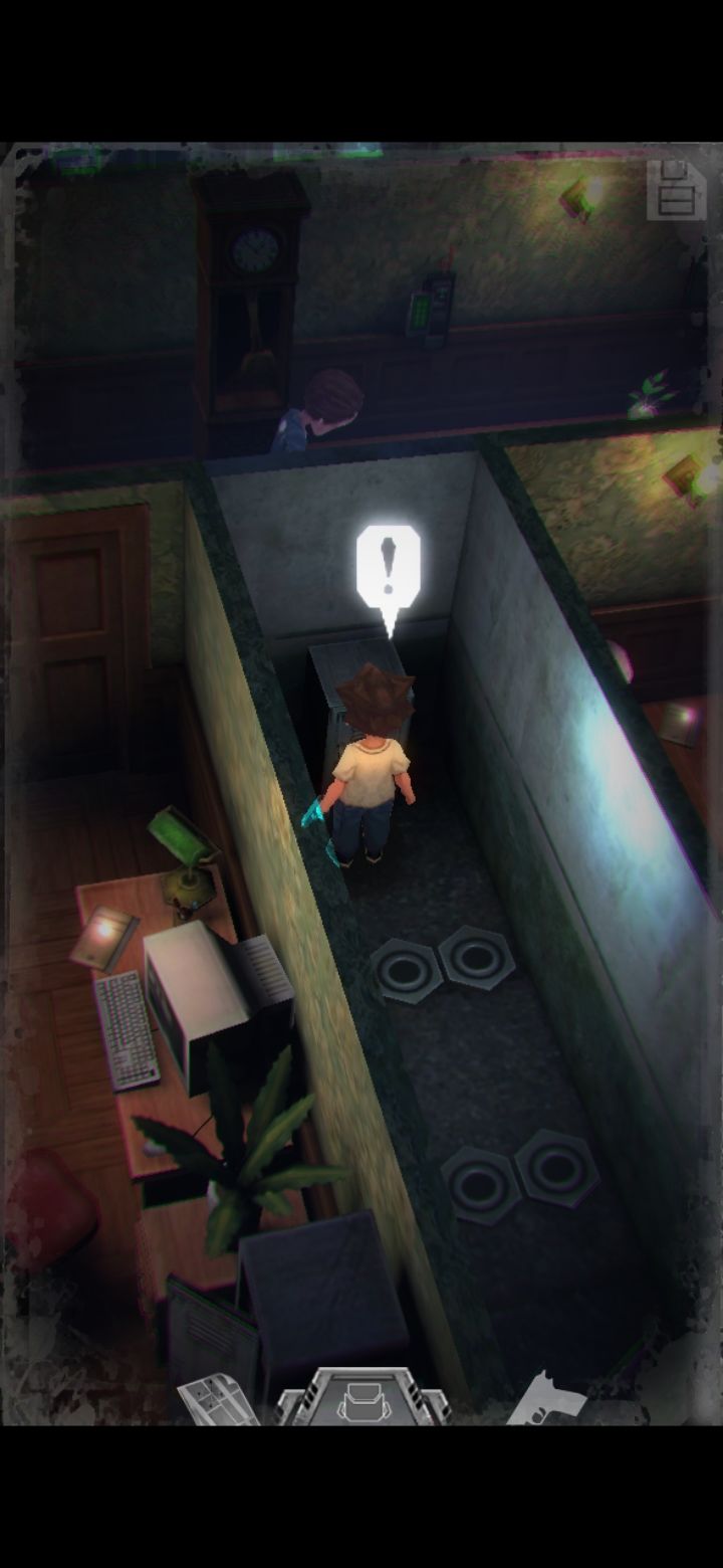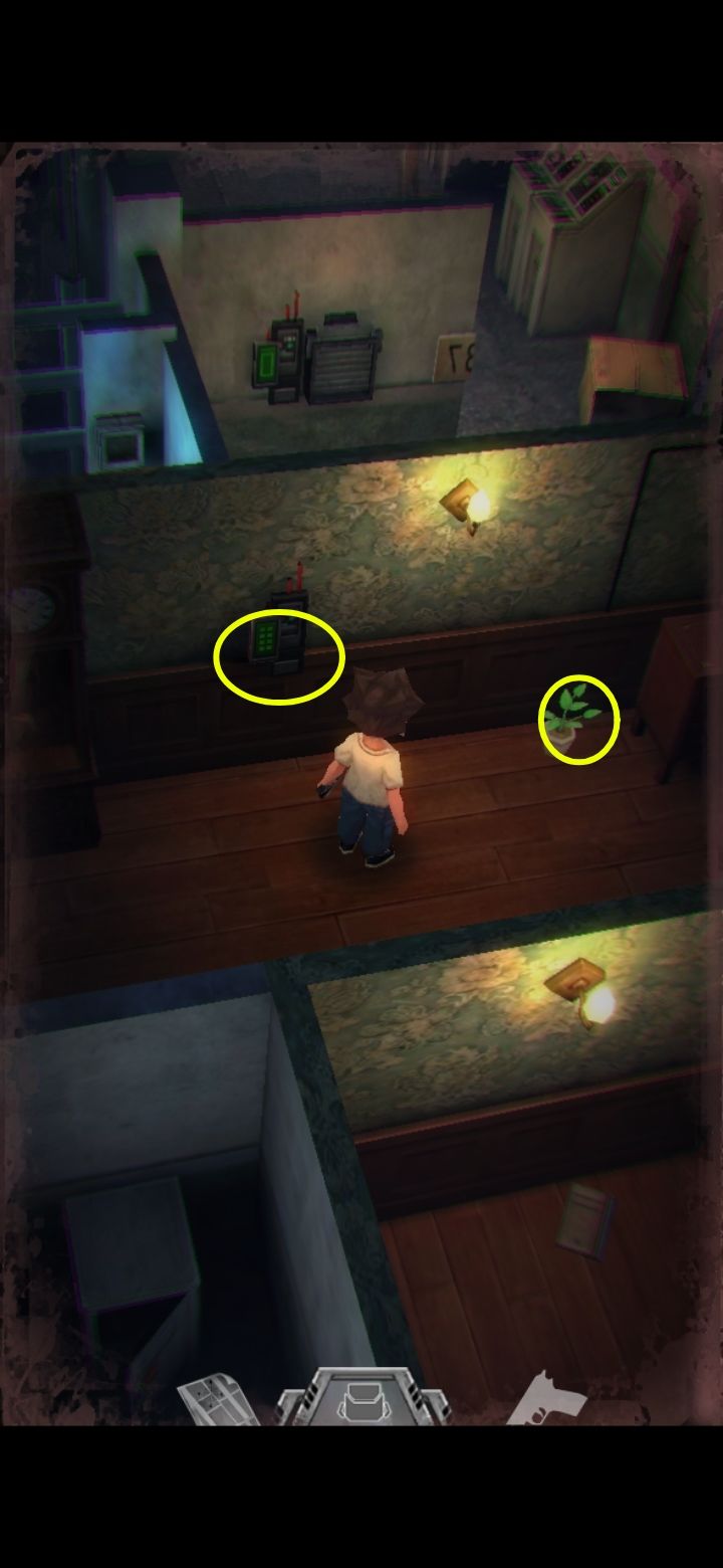 进入这个房间以后会触发秃顶,打死以后看日记,提示“不把它拿在手里就好了”,打开背包卸下手枪就能过去。日记里再次提到鲍勃办公室的挂钟,提示密码需要用在这里。