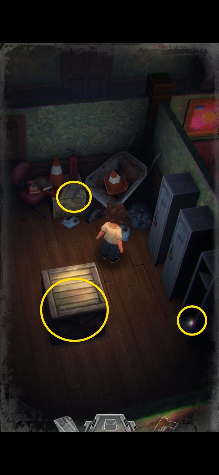 箱子是储物箱,可以存储物品(男主的背包容量有限,可以把暂时用不到的东西装进储物箱)。杂物间的门需要钥匙,用红圈标识。走到如图所示的位置,按照箭头的方向面向这个铁制置物架,松开***,长按屏幕任意处就可以朝男主面向的方向推动物品,把架子推开后,从墙壁空缺处走进另一个房间。