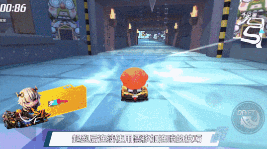 起跑后连续使用漂移+连喷的技巧,在第一个直角弯道前集满一个氮气,并使用拖漂的技巧通过直角弯。