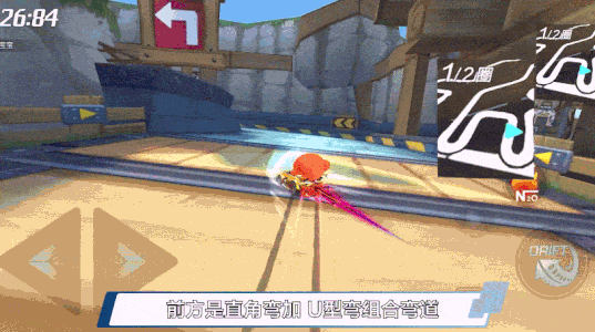 前方是直角弯+U型弯组合弯道,先使用拖漂+拖漂延续的操作通过前两个直角弯,出弯后,衔接断位拉车头的操作,快速摆正车头方向并驶入下一个U型弯道,最后使用拖漂+断漂补气的操作技巧通过U型弯道。