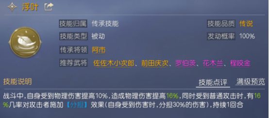 白起二技能推荐浮叶,以提升自身受到的物理伤害为代价,换取对敌人造成物理伤害的提高。并且还有一定几率让攻击者分担自身受到的30%伤害。浮叶和义气千秋的联动效果让白起的输出及保护能力大大提高。